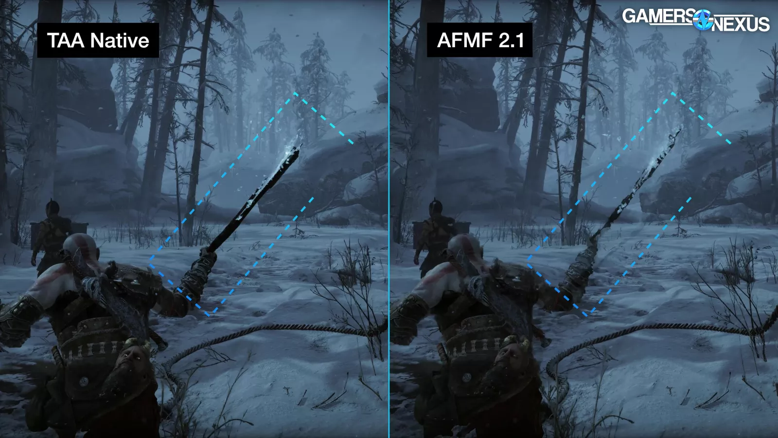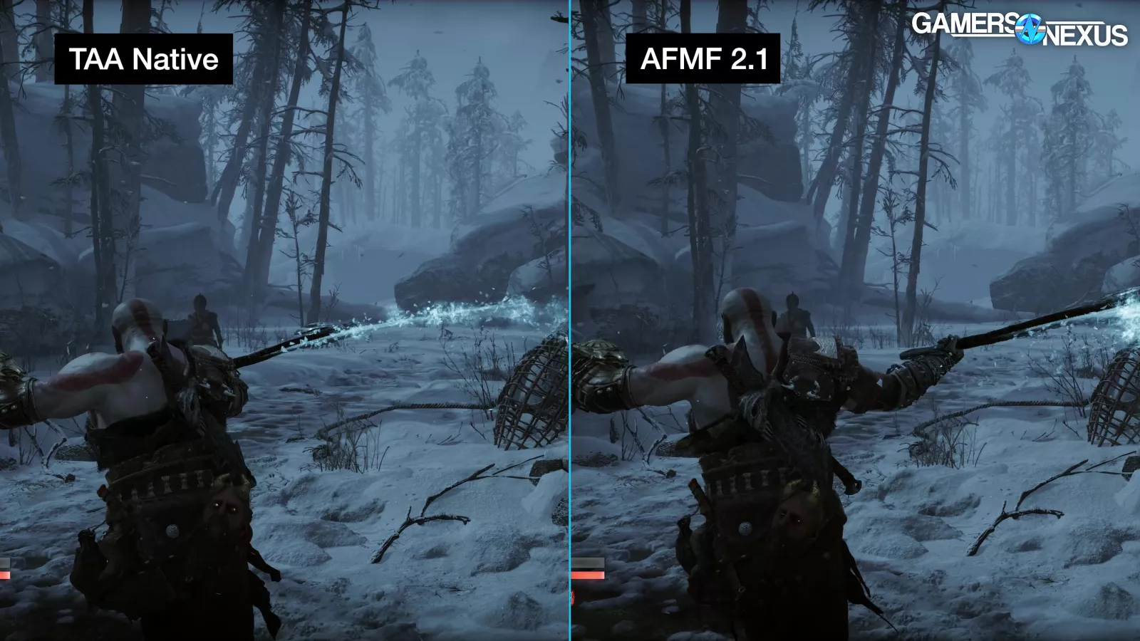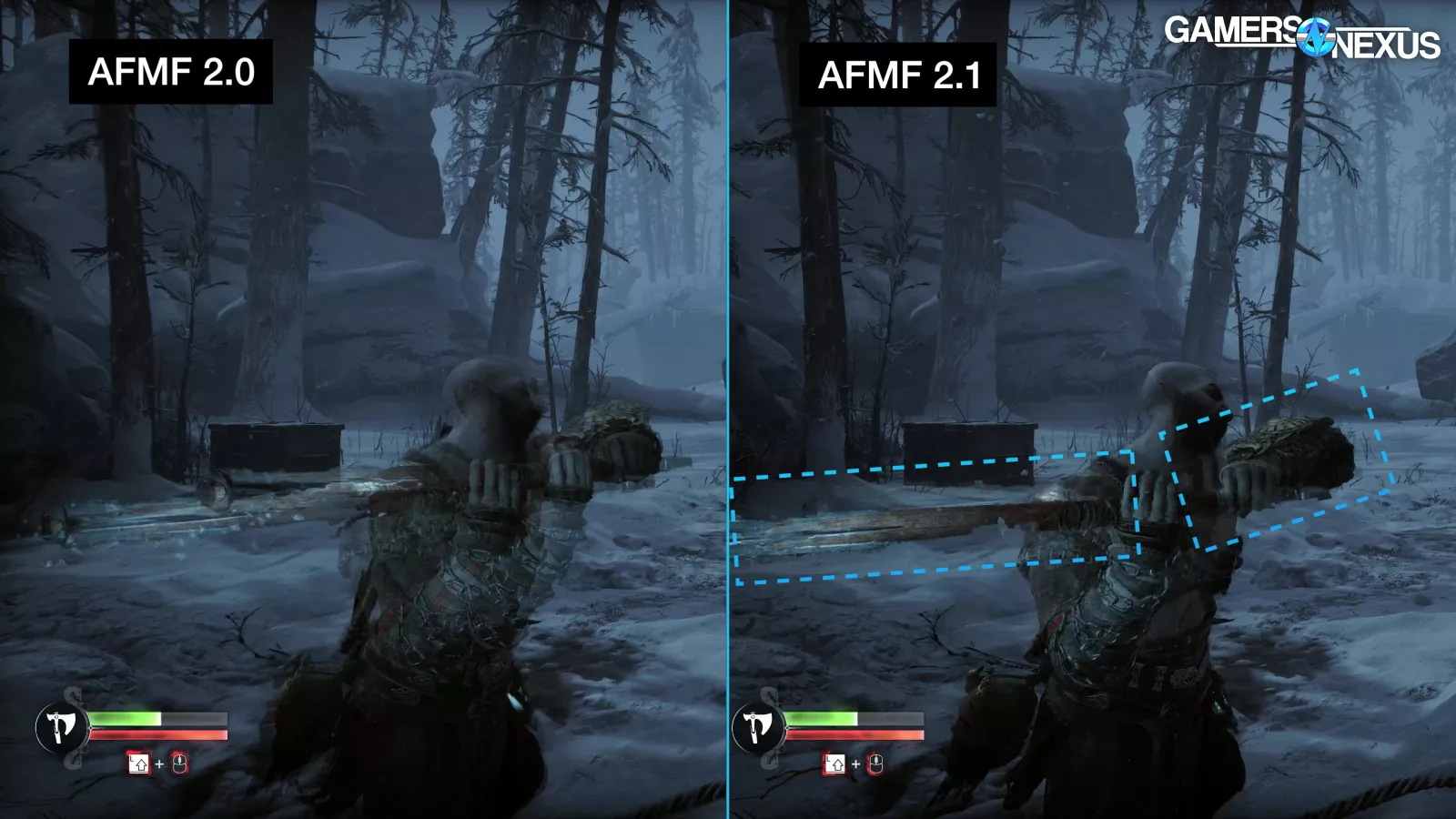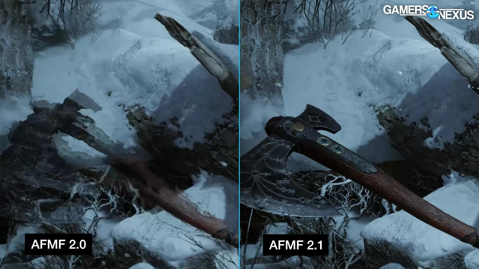 By swinging Kratos' axe in front of the white snowy background, we can clearly see ghost images with the older AFMF 2.0 frame generation. Direct frame by frame comparison is more difficult here due to the lower frequency of generated frames, but it's clear that the generated frames with 2.0 more commonly have ghosting around the axe and even Kratos' model. 2.1 shows some artifacts as well, but it's usually in the form of unevenness in the outline of the axe and Kratos' arm as they swing forward, while the core of his model is better preserved.
