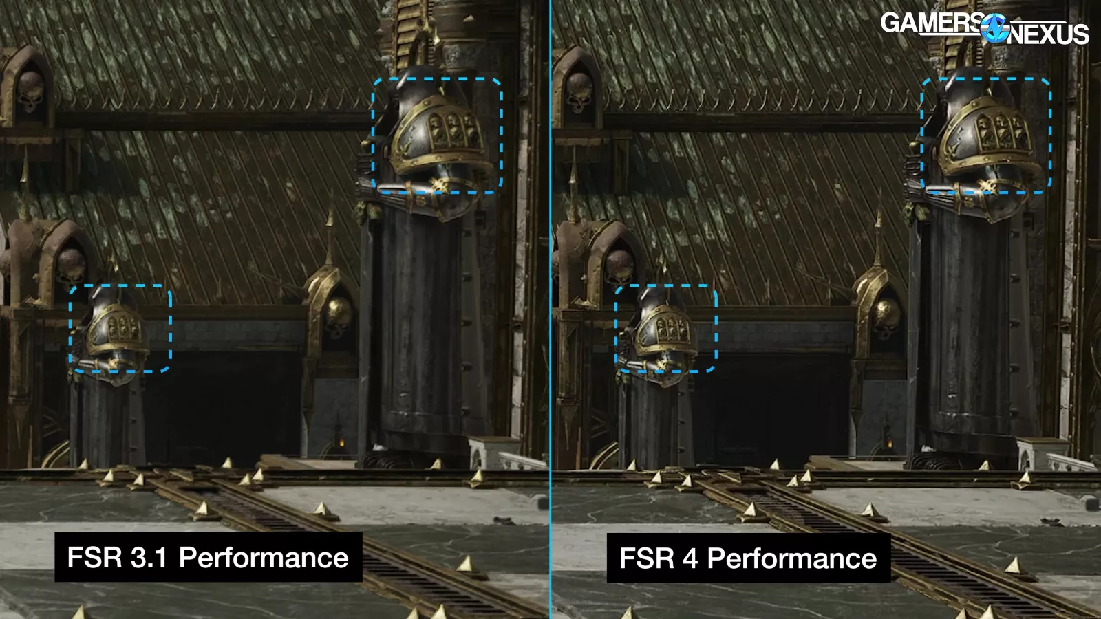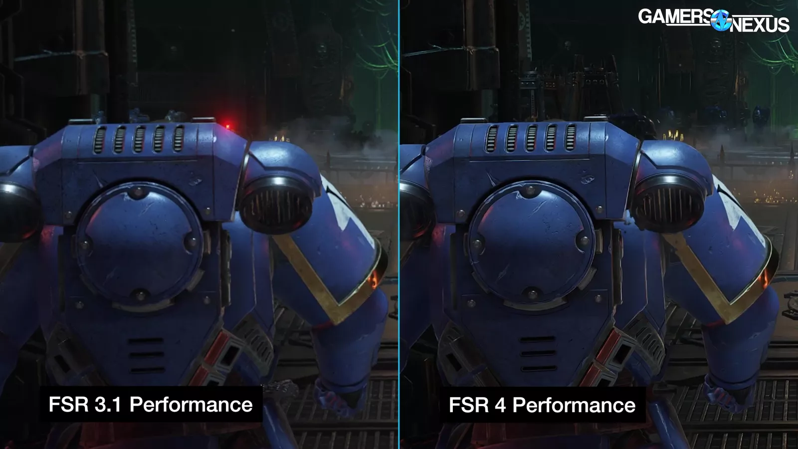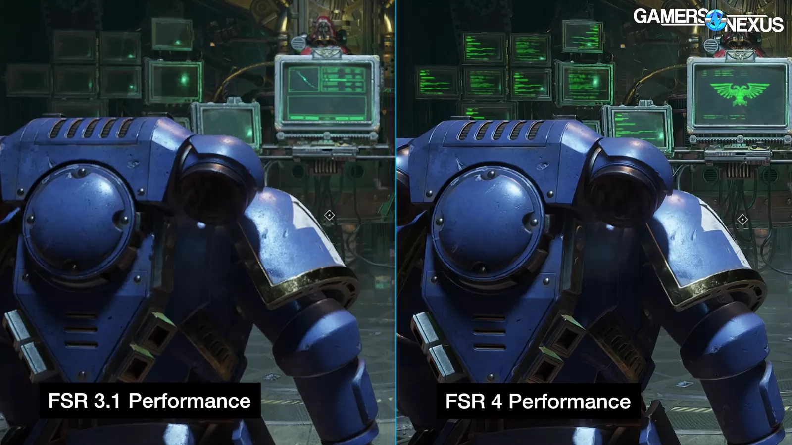 We’ll start the comparisons with a scene in the Armory, or “Armouring Hall” in native Grimdark. Even before walking forward, the difference between FSR 3.1 and FSR 4 is stark. Static elements like the floor of the walkway that shift and shimmer heavily with FSR 3.1 are now stably locked-in. On top of that, the entire image is much clearer and more detailed.