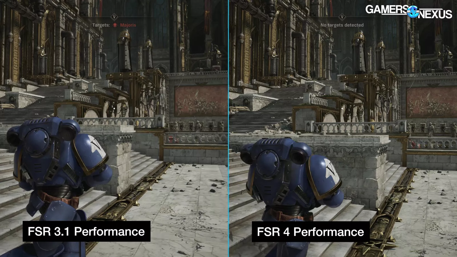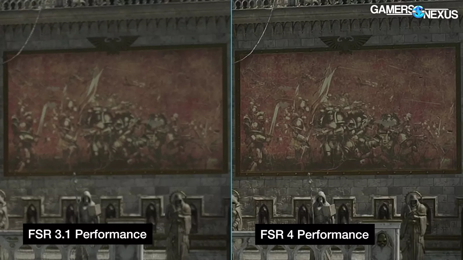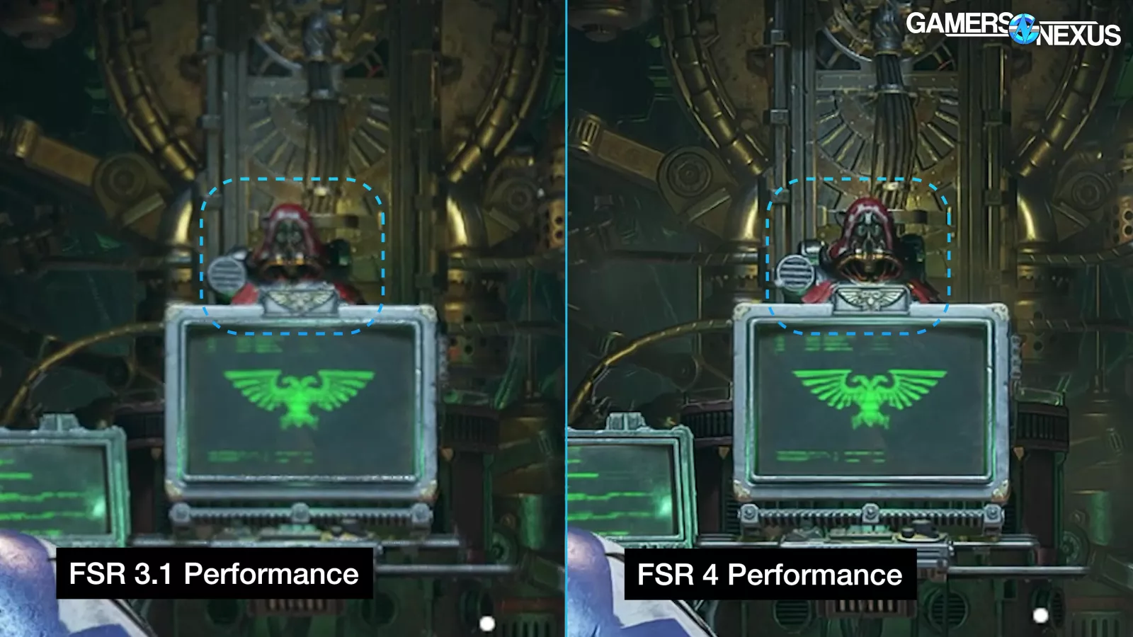 We’ll start the comparisons with a scene in the Armory, or “Armouring Hall” in native Grimdark. Even before walking forward, the difference between FSR 3.1 and FSR 4 is stark. Static elements like the floor of the walkway that shift and shimmer heavily with FSR 3.1 are now stably locked-in. On top of that, the entire image is much clearer and more detailed.