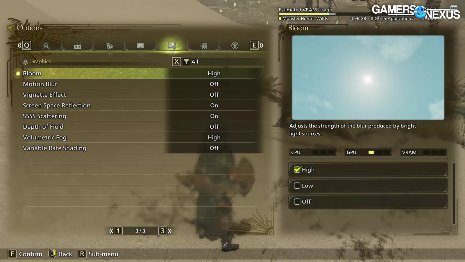 Monster Hunter Wilds is up next. We used the High graphics preset, but turned off anti-aliasing and camera effects like motion blur, vignette, and depth of field. We also reduced camera shake to its minimum levels. Cutscenes are entirely in-engine, which is useful, so we got a mix of those with some actual in-game capture.