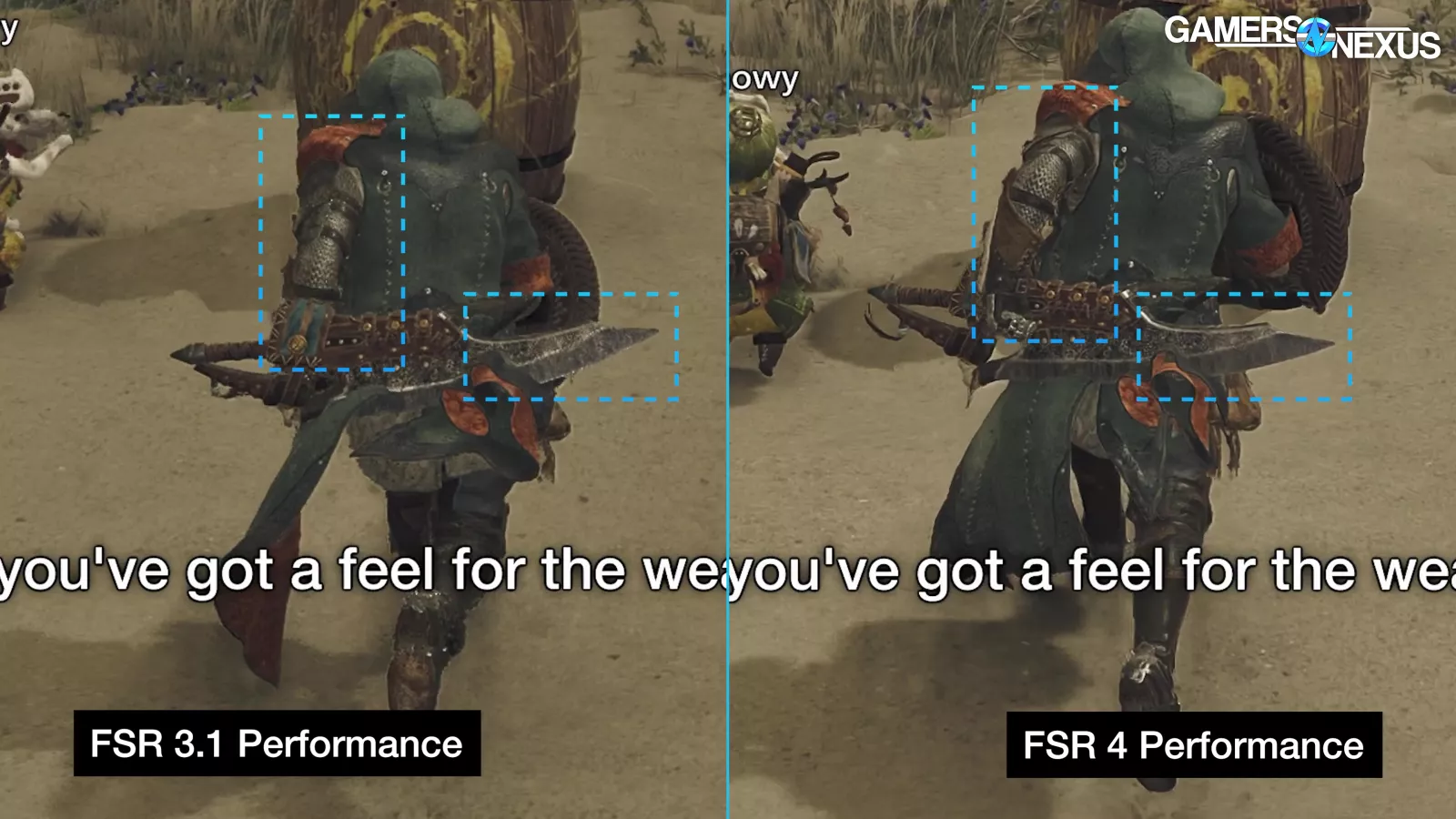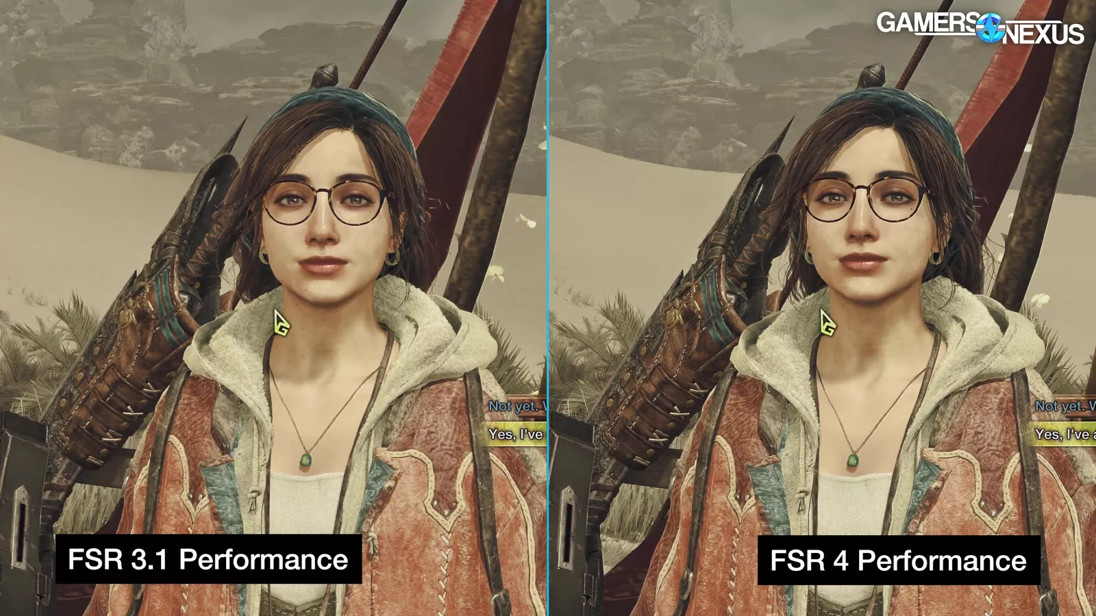 Jumping into the actual game at the point you choose your weapon by the small oasis shows an ugly pattern superimposed over the sand when using FSR 3.1 that goes away with FSR 4. It doesn’t make the game unplayable or anything, but it’s pretty distracting.