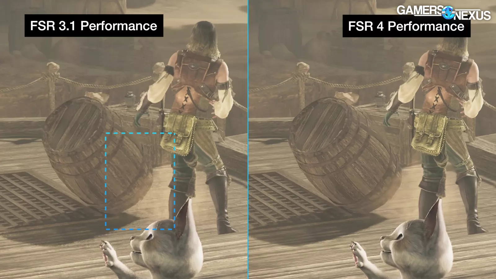 Smeared trails behind NPCs and barrels are improved upon with FSR 4, but sometimes still present.