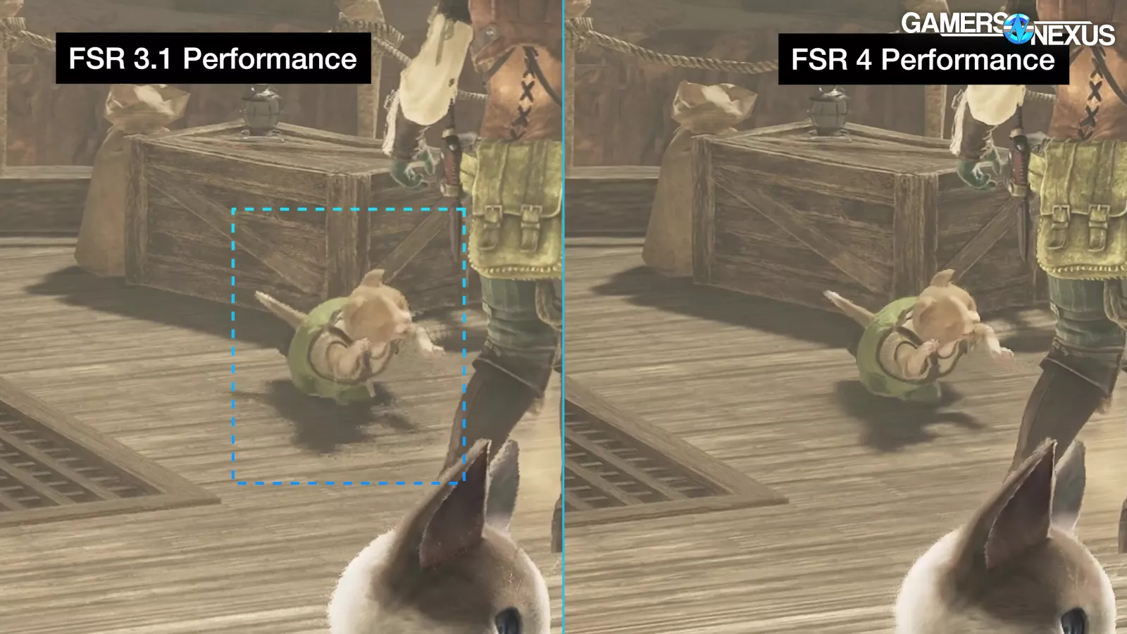 One clear difference is in trails behind objects moving across a patterned background. For example, when the two Felynes drop the barrel, it leaves a smeared trail behind it on the wooden walkway, as does the NPC on the left side of the screen and the unfortunate Felyne as it falls backwards. We think FSR 3.1 handles this very poorly – FSR 4, while not perfect, definitely does better.