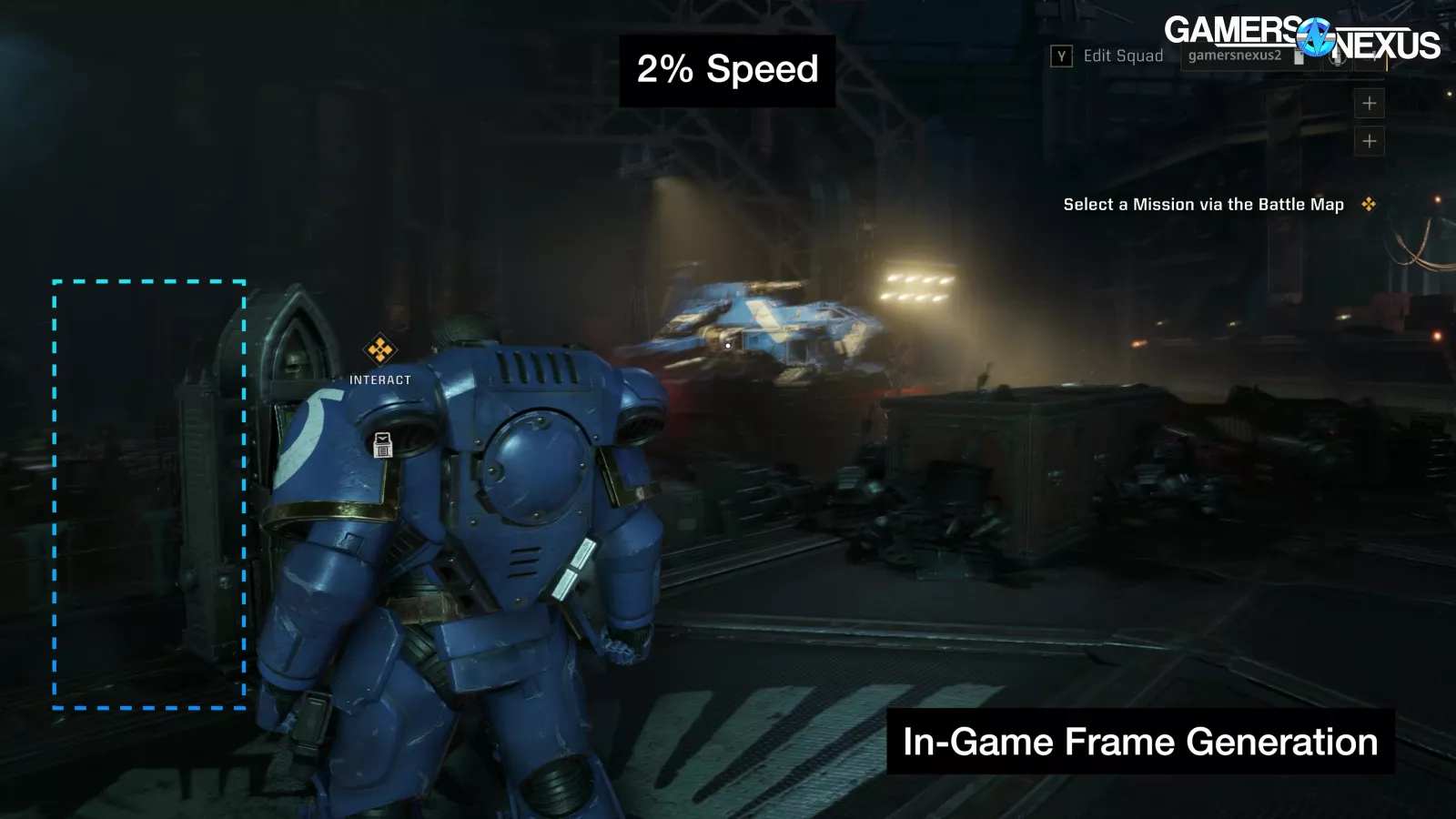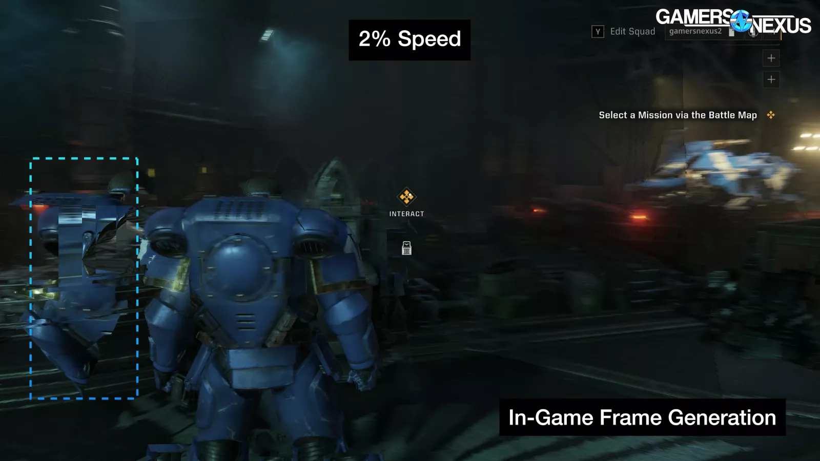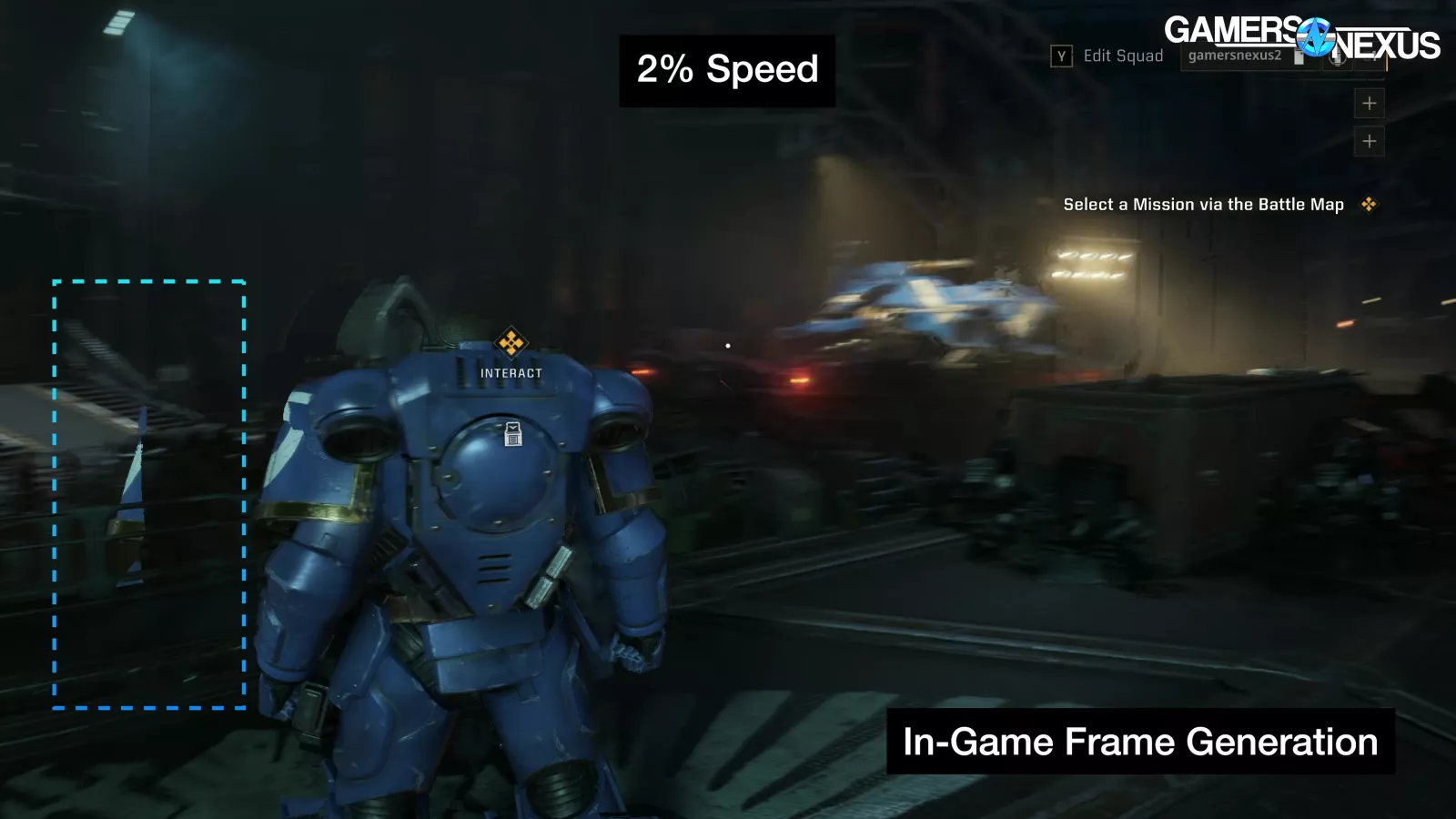 We recorded an additional scene in Space Marine 2 to show the downsides of frame generation. These clips aren't tightly controlled or synchronized; we just loaded into the main hub and shook the mouse around violently, so we’ll freeze frame some parts to show the issues. Besides making it very obvious that motion blur was still on (despite being toggled off), this allows us to see multiple frames where AFMF is definitely applied on top of UI elements like the "Assemble" waypoint. Applying frame generation on top of UI elements can cause ghosting and duplication of UI elements, which just looks bad. We can compare this to the in-game frame generation option, which is also a garbled, muddy mess in this scenario, with distortions around the edges that almost look like eye floaters. It completely breaks in this scenario, but perfectly preserves the UI layer even in the worst frames.