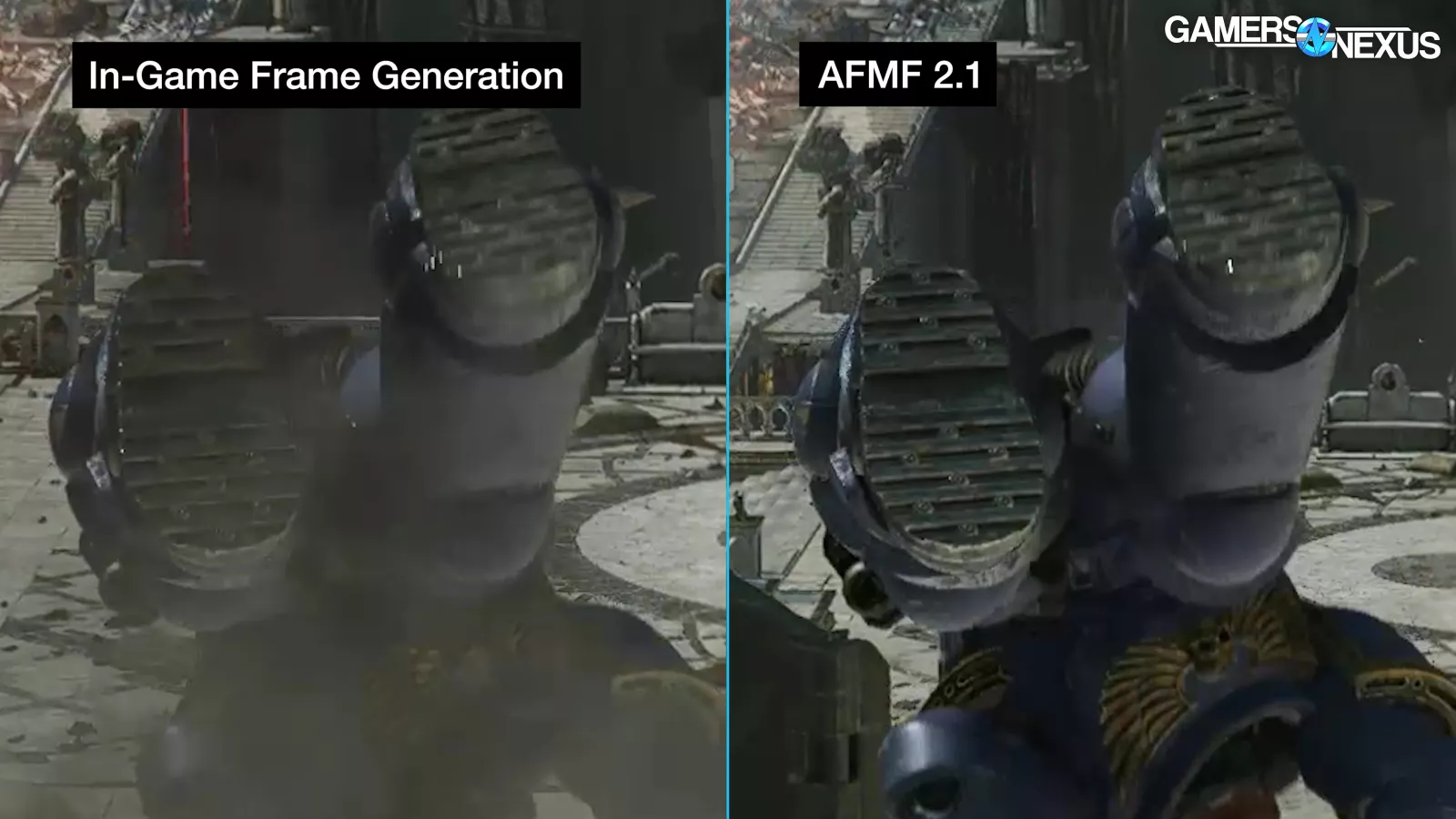 Checking back against God of War's specific implementation of in-game frame generation, we see the same behavior as in Space Marine 2 where the details of Kratos and the axe are excellently preserved, but there's a distinct outline where framegen has done its version of content aware fill in the area that those objects will occupy in the next real frame. In comparison, the fullscreen AFMF 2.1 effect has more distortion around the usual axe and arm area.
