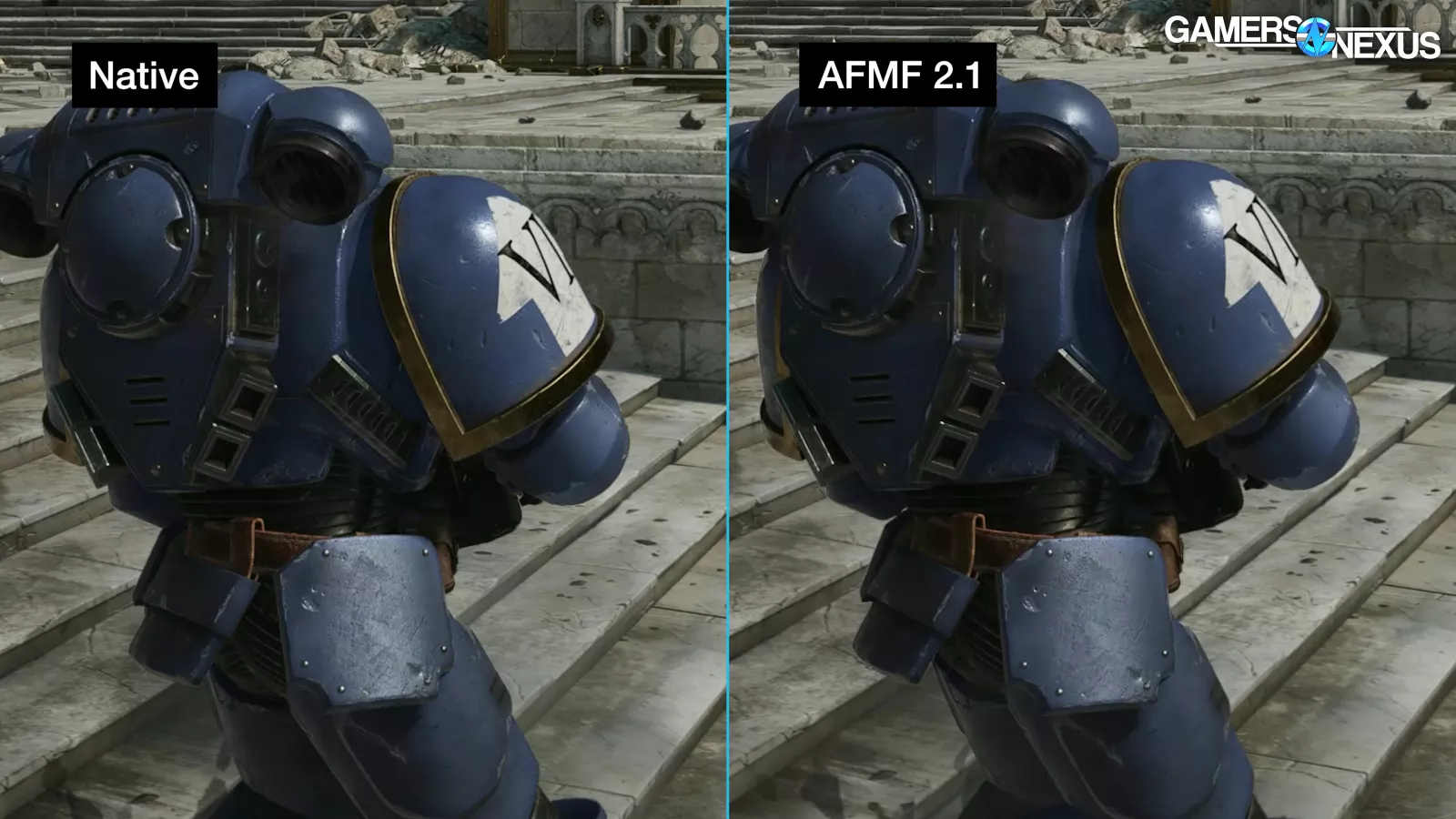 The frame-by-frame playback of AFMF 2.0 versus 2.1 reveals greater differences, with a prominent secondary image surrounding the marine's right arm in advance of its movement in the next "real" frame. This only affects moving elements of the scene; there's no noticeable sign of frame generation in the relatively static background even with the older version.
