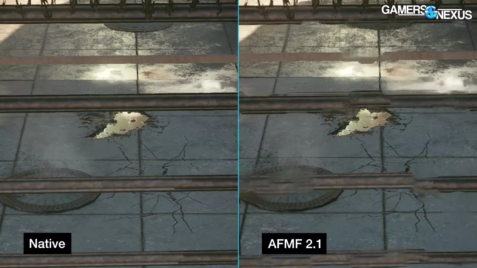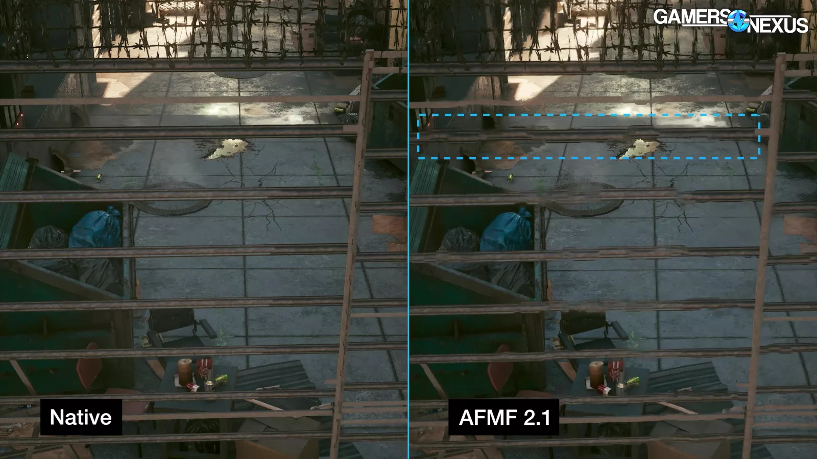 Again, we can check back against the native footage for confirmation that the behavior we're seeing comes from AFMF. The horizontal fence bars are straight and uninterrupted in each frame of the native capture, whereas they're frequently broken up and uneven in the AFMF 2.1 footage, although AFMF 2.1 does do a fairly good job of preserving the scene behind the fence without major framegen distortion.