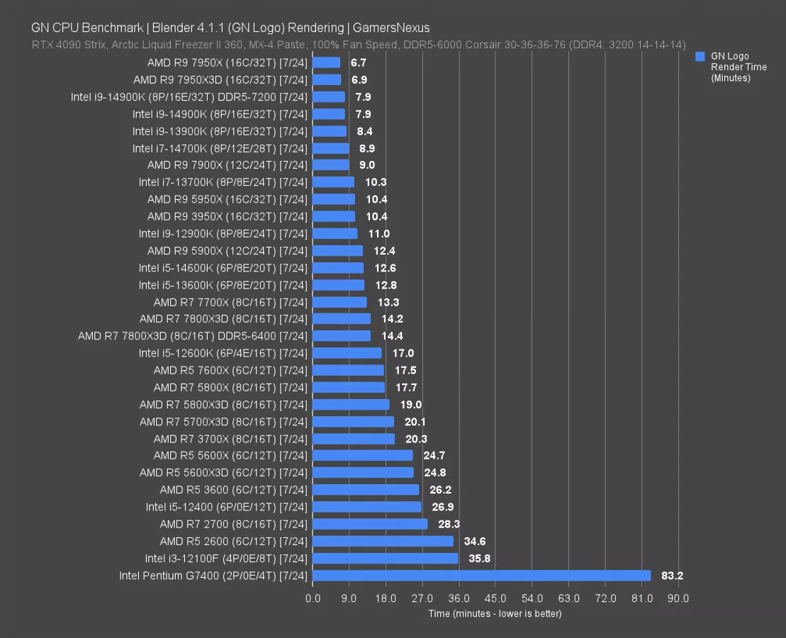 The best result on our new chart is the 7950X3D at 73 minutes, followed within variance by the 14900K at 75 minutes. The worst on the chart is the G7400 -- we won’t expand the scale to accommodate it since it’s a one-off, but that bar that breaks the chart is 619 minutes. A more reasonable “worst” would be the 2600, down at 311 minutes.
