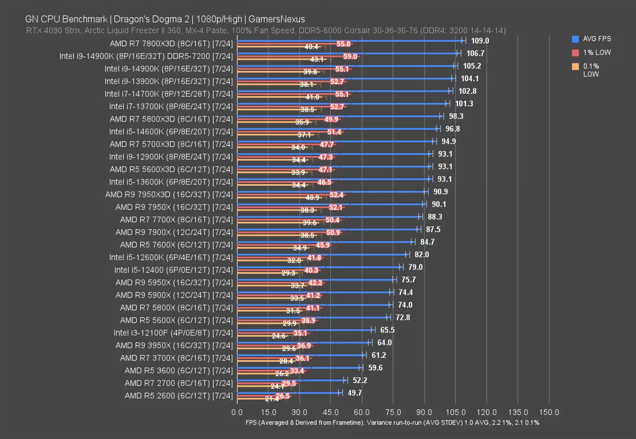 Dragon’s Dogma 2 was a mess at launch, has received patches, and is still somewhat of a mess -- but it’s a great CPU benchmark. This is a 2024 title. We have a whole separate piece on Dragon’s Dogma 2 if you want to learn more about our testing methodology on the game.