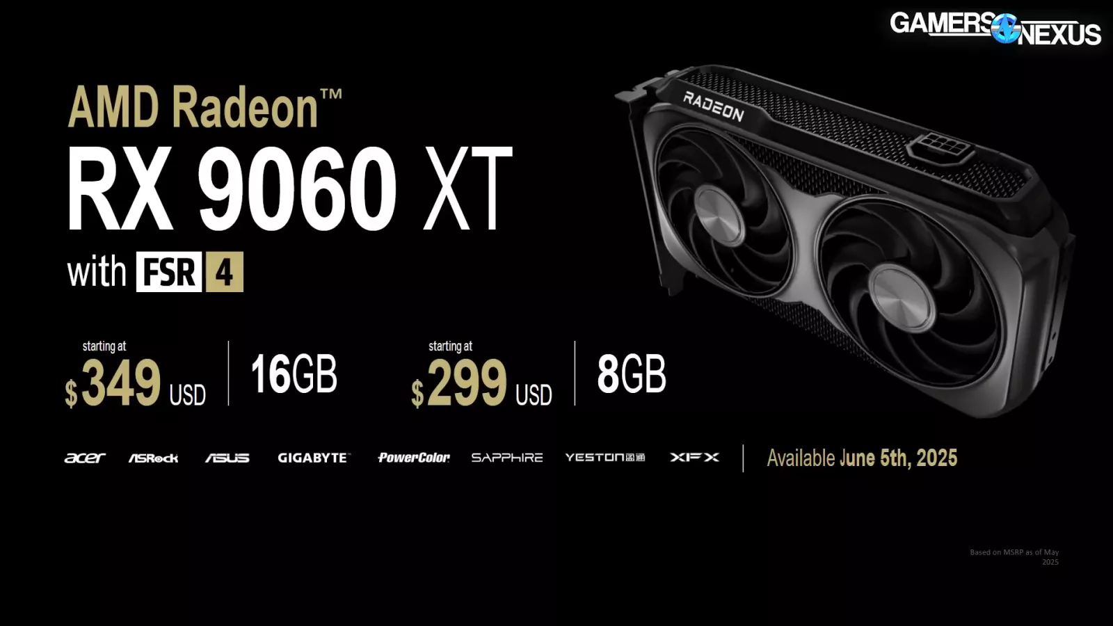 The 9060 XT 16GB will be $350 with the 8GB model at $300. They will release on June 5th. The GPU die is the same for both models, but new from the 9070 (read our review) and 9070 XT (read our review) (which also shared a GPU die). The new die is Navi 44 for the 9060 XTs and sized at 199mm^2, down from 357mm^2 on the 9070-class cards.
