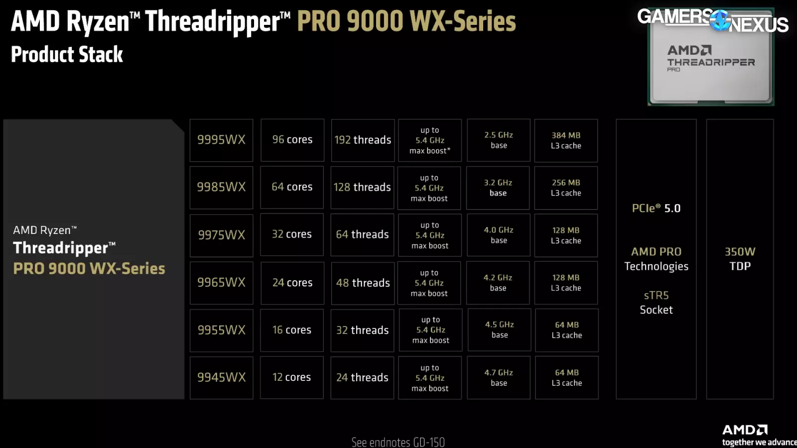 For AMD’s Ryzen Threadripper PRO 9000 WX-Series: The company announced six new CPUs, which include the 9945WX, 9955WX, 9965WX, 9975WX, 9985WX, and the flagship 9995WX. Starting with the 9945WX and working our way up, these chips will come with core counts of 12, 16, 24, 32, 64, and finally 96 cores for the 9995WX. This mirrors the existing and prior 7000 series CPU configurations just now on Zen 5.