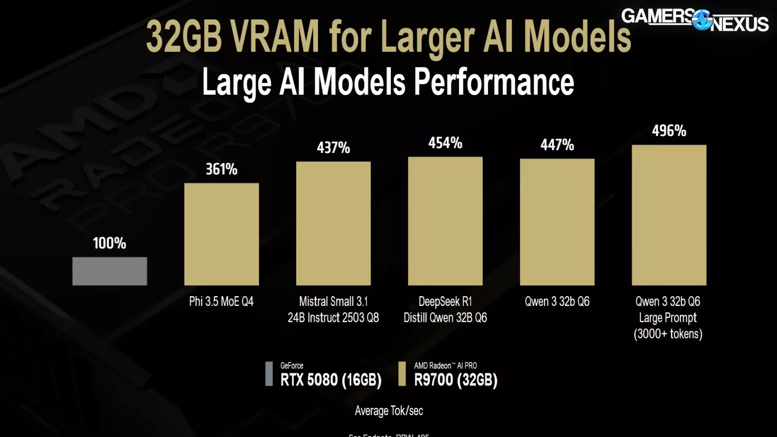 To expand upon that point, AMD includes another chart labeled “Large AI Models Performance” where it compares an RTX 5080 (read our review) to its AI Pro R9700. Once again, this chart demonstrates how 32GB offers access to run larger models that 16GB just can’t handle. These results are expected. We think a more meaningful comparison might’ve been using the RTX 5090 that also has 32GB of VRAM. This would represent a more like-for-like scenario but we don’t do a lot of ML testing so we’ll leave that for someone else.