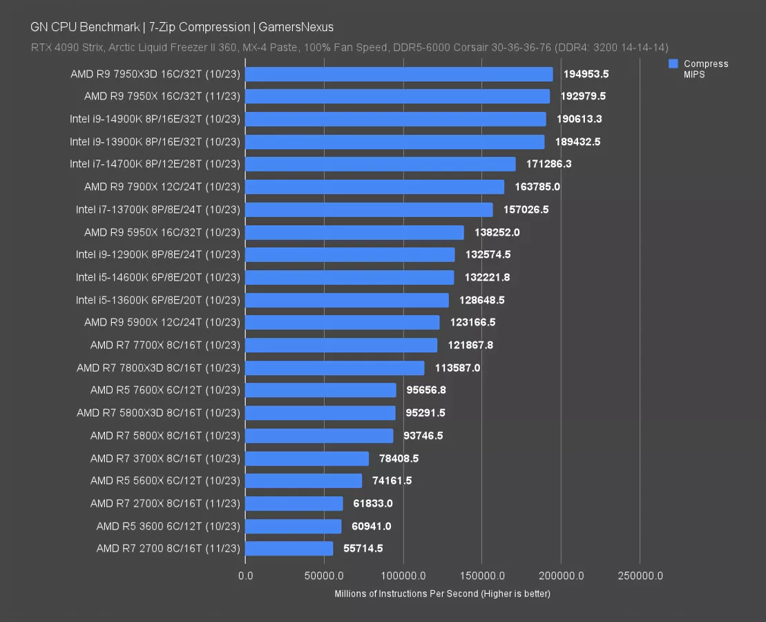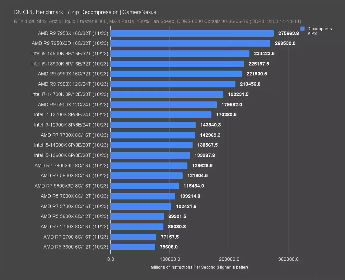 Decompression shuffles the stack a little bit. The 2700 and 2700X run at 77K and 89K MIPS, respectively. It’d be worth overclocking the 2700 for this kind of performance if you plan on staying with it. The 7700X would offer a significant improvement for a new platform, although the 5950X runs impressively far ahead for its age -- and again, it ran in the same motherboard as our 2700. The best new Intel option here would be the 14900K, but it’s priced in a different bracket. The 14700K and 14600K are hard to get excited about as compared to the 5950X or 5900X.