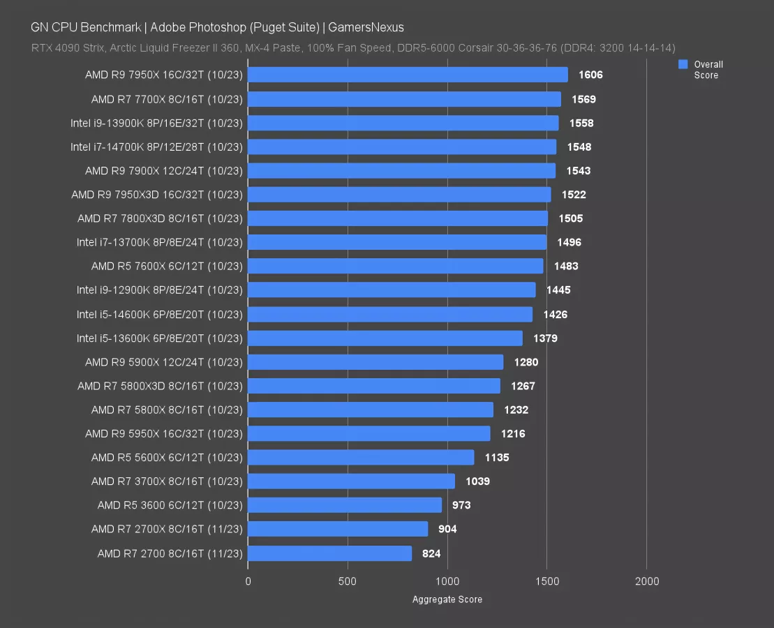 Finally, in Adobe Photoshop, the chart leaders in the 1500 to 1600 range show scaling room approaching 2x improvements. Extra cache isn’t helping in Photoshop, but the 7700X at 1569 points sees its biggest contribution in the filter score and GPU score, where the GPU can be better leveraged. Almost anything would be an upgrade here -- other than maybe the R5 3600.