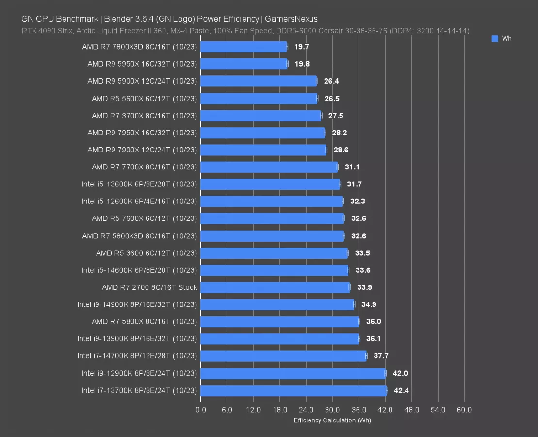 Finally, we’re looking at efficiency. This is judged using Blender render time against power consumed, with the unit of measurement as Watt-hours. In terms of energy efficiency, the 2700’s 33.9 Watt-hour result had it more efficient than a 14900K, but it’s obviously far less effective in performance. In other words, the 14900K will complete more work in much less time, but given a fixed unit of work, the 2700 will require slightly less energy doing it. The 7700X offers a notable efficiency uplift, at 31.1 Watt-hours. The 5950X remains one of the most efficient CPUs we’ve ever tested, thanks to its fine-tuned and low Vcore.