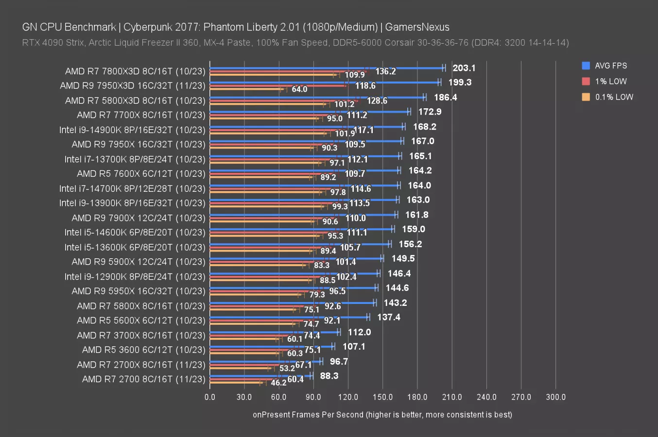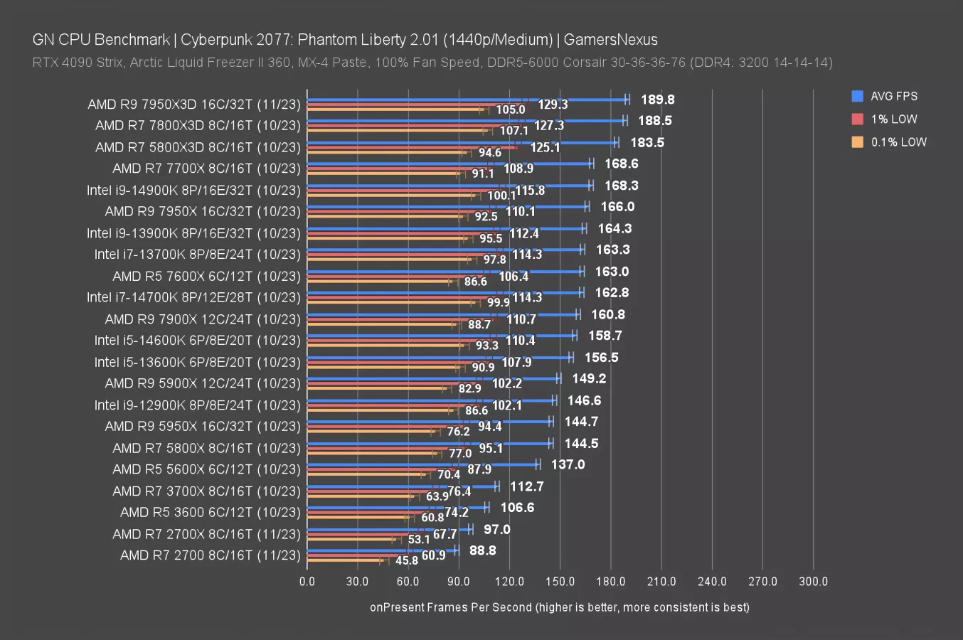 If you wanted a brand new system for one reason or another, AMD’s same-price modern replacement for your MSRP $300-$330 2700 series CPUs would be the R7 7700X. That one’s at 90FPS AVG. It’ll have benefits elsewhere, like production applications later, but it’s not better than the 5800X3D for a pure gaming user. You’d save a lot of money sticking with one more run of AM4. A worthwhile, next-gen upgrade would have to come in the form of an Intel 14700K, 13900K, or 14900K, all of which will have more benefits in production than gaming. The 7800X3D might make the most sense for its bigger jump, but at $100 higher than your original 2700 purchase price.