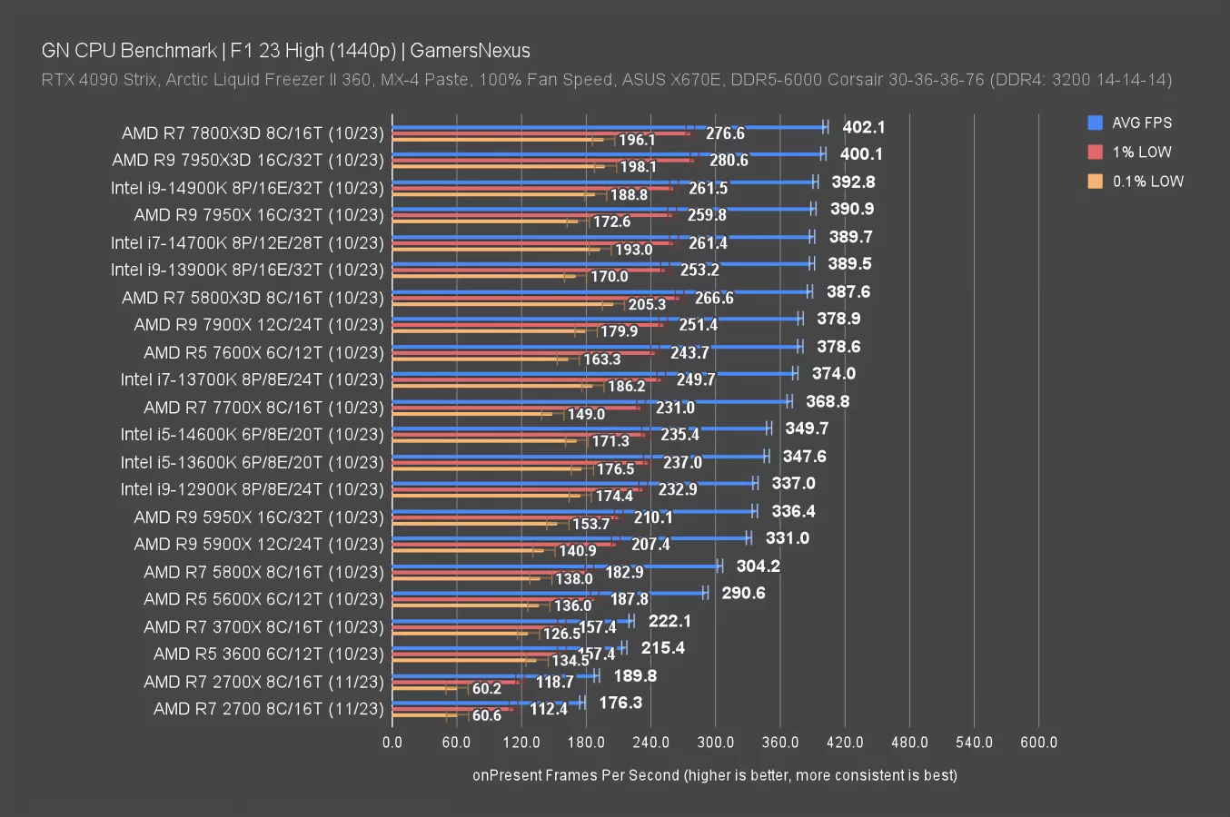 The 5800X3D offers a staggering 154% uplift over the 2700, or 136% over the X-SKU. If you wanted the modern I/O capabilities of a new platform, the 7800X3D would boost that to a max of 188% against the 2700. The 7700X comes in lower than the 5800X3D again, but would get you to a new platform while still providing 130% improvement. The 14700K is about the same uplift at 407FPS AVG, with similar benefits of a modern platform for those who know they need them.