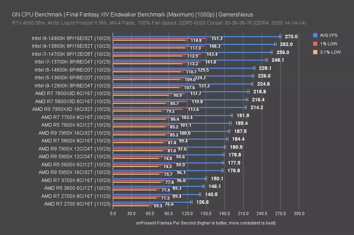 Here’s the chart. FFXIV’s benchmark test is interesting mostly because it has favored Intel’s CPUs for a long time now. The 7800X3D and the 12900K mark the start and end of compartmentalized AMD and Intel sections, with Intel holding a generally strong advantage. We think some of this is due to GPU driver behavior as well.