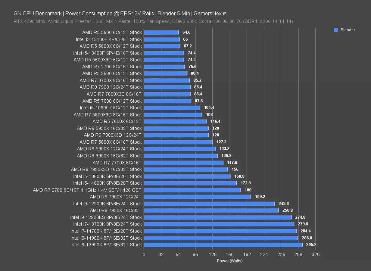 For power consumption, the R7 2700 pulled about 76W in an all-core workload. Our overclock was a bit over-the-top back in the day, pushing it to 180W but improving performance notably. You could fine-tune this a little lower. The biggest improvement in modern CPUs though is the efficiency: Despite higher outright stock power consumption in something like a 7700X, at 148W, or 5800X3D at 108W, the output per Watt is much higher. CPUs in the 14-series are huge power consumers, especially the 14900K at 287W and 14700K at 284W.