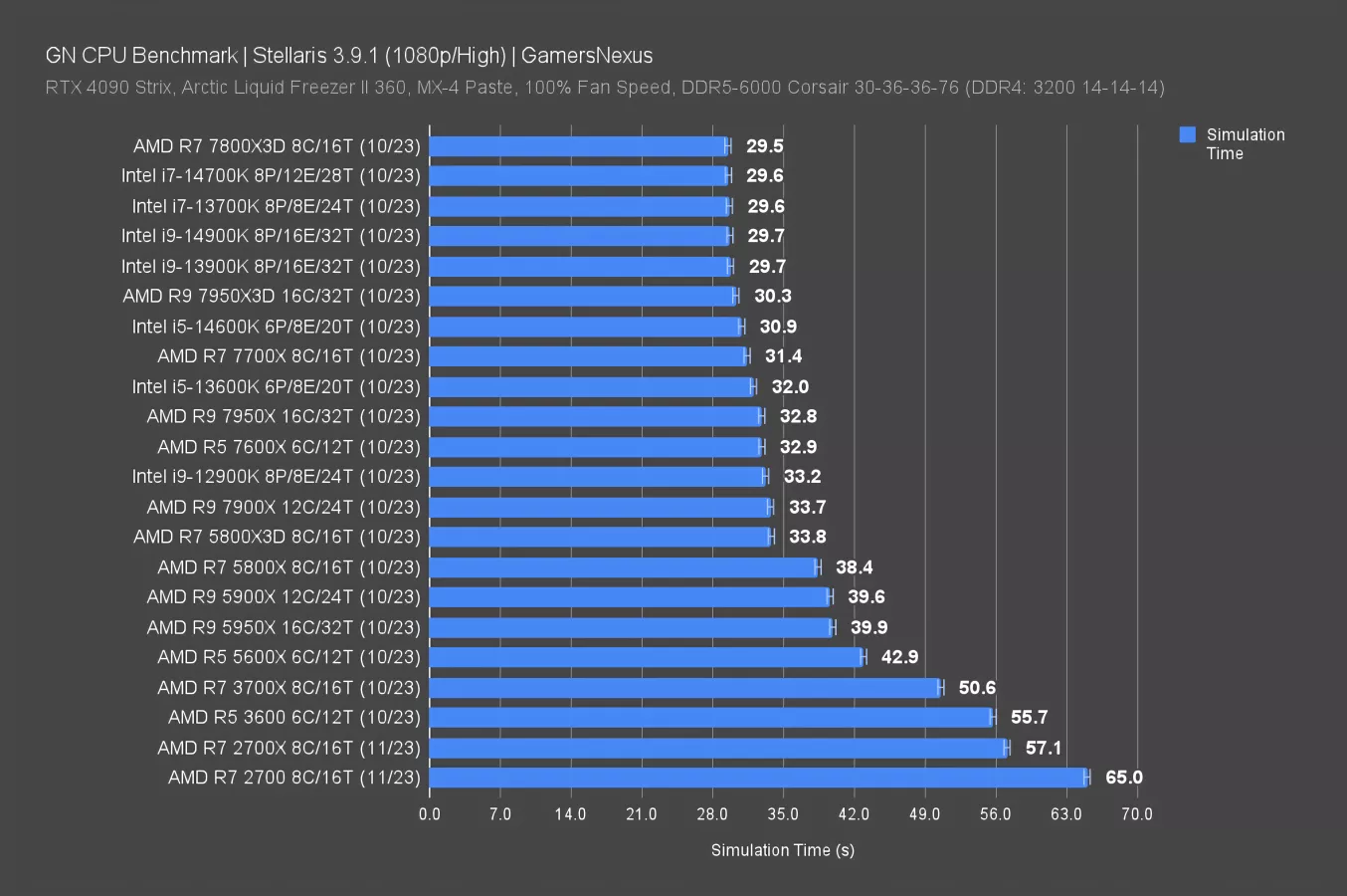 Stellaris CPU simulation time is next. This one bottlenecks hard at the top-end of performance, where everything from about the 14600K and up can be considered the same.