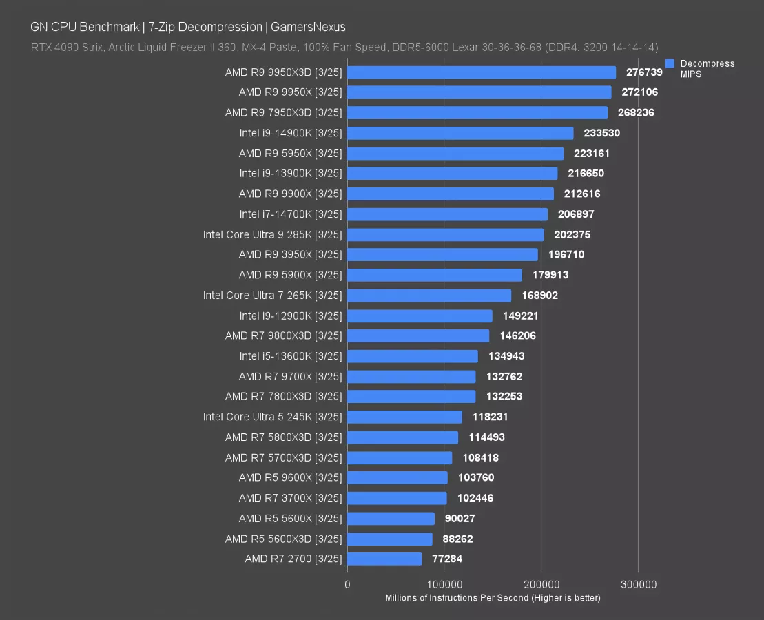 In 7-Zip Decompression, we measured the 9950X3D at 277K MIPS, with the 9950X non-3D at 272K MIPS. You wouldn’t really benefit from the 9950X3D in a meaningful way in either compression or decompression in this workload. The 9950X achieves all of the performance already, so you’d need use cases that more directly leverage the cache to get value out of the 9950X3D.