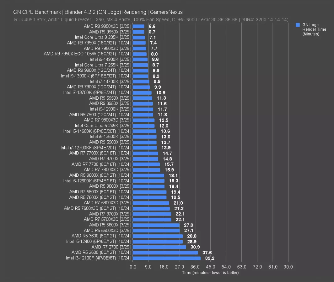 The 9950X3D outperforms the 285K here, with about a 7% reduction in total time required to complete the render.