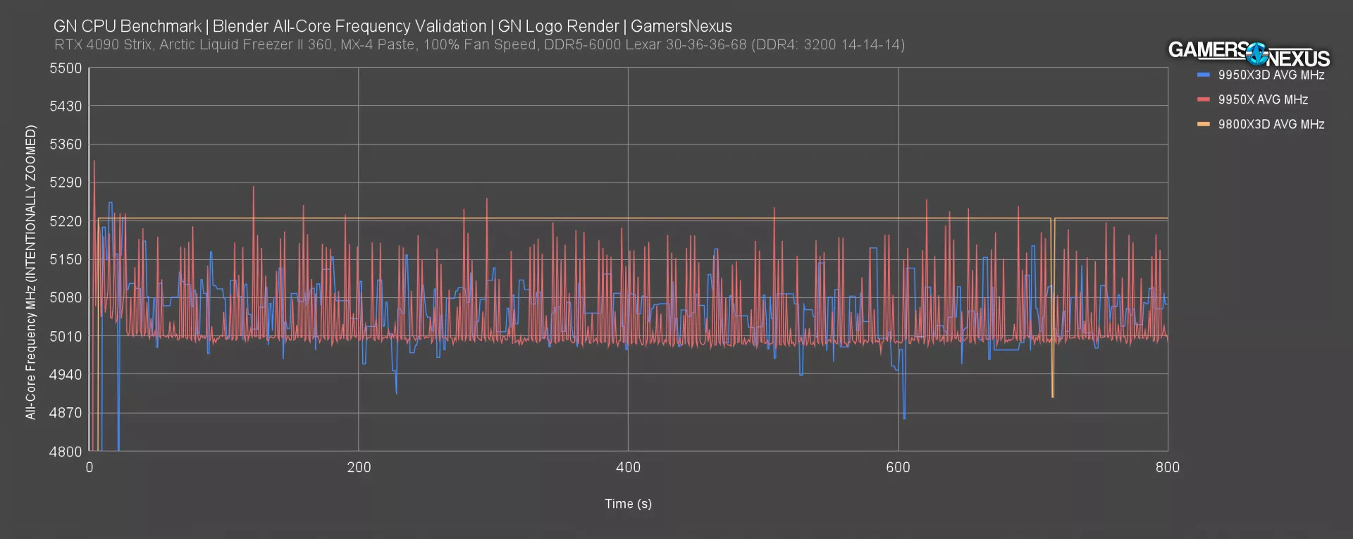 First up is the Blender all-core workload. In this test, the 9950X3D had a frequency plot that started at about 5250 MHz, but settled closer to 5020 MHz to 5080 MHz during testing. This chart is intentionally zoomed-in to make it easier to see, so the scale purposefully does not start at 0.