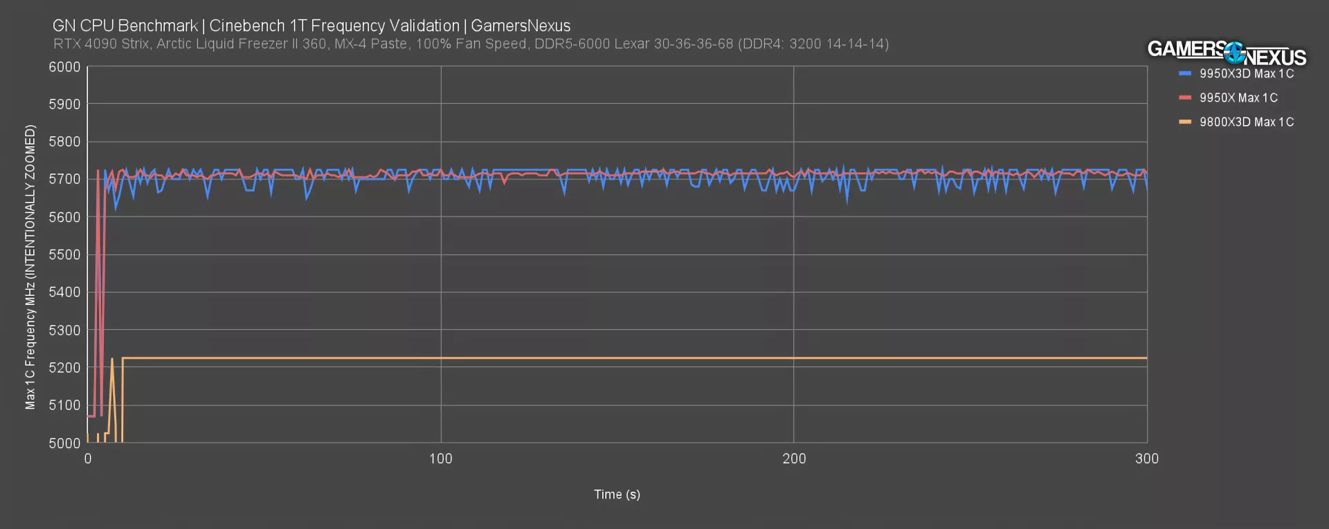 The 9800X3D holds 5225 MHz throughout the test so it’s lower than both when in a single-threaded workload in this situation.