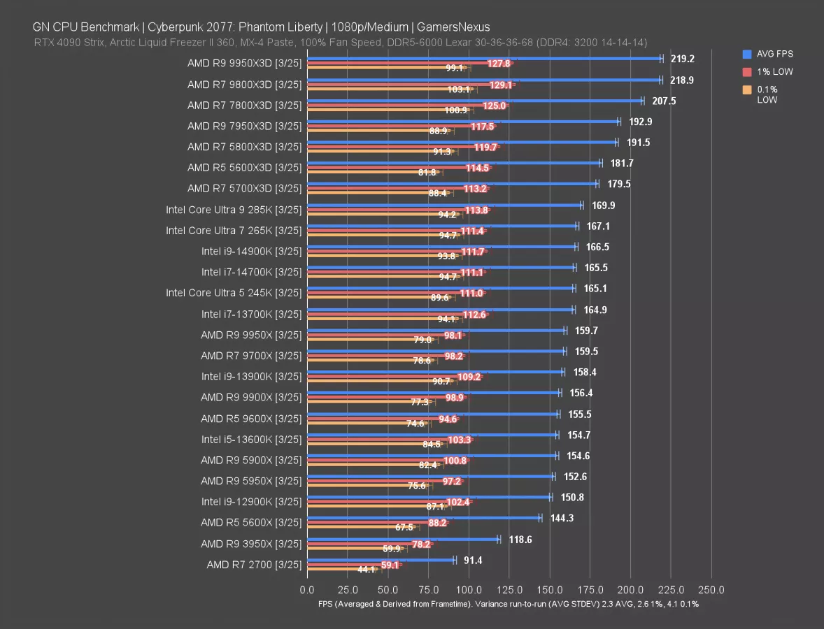 Cyberpunk 2077 is back in our CPU test suite again with the Phantom Liberty expansion. Tested at 1080p/medium here, the 9800X3D and 9950X3D both ran at about 219 FPS AVG and were well within run-to-run variance at only fractions of a frame per second apart. The 7800X3D trails, but not by much. It’d be roughly the same experience as these two.