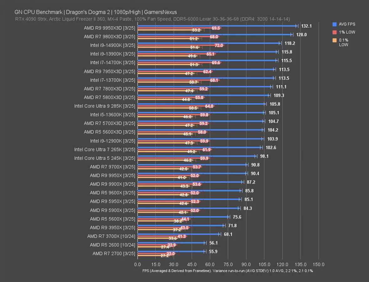 In Dragon’s Dogma 2, the 9950X3D leads the chart. It landed at 132 FPS AVG here, passing the 9800X3D by a measurable but irrelevant 3.2%. Both CPUs lead all of Intel’s, although Intel at least lands its prior two generations ahead of the 7950X3D and 7800X3D with the game’s updates. This game really seems to benefit from extra cache, with the 9950X3D leading the 9950X by 46% and the 9800X3D leading the 9700X (although they have other differences) by 41%. Dragon’s Dogma 2 remains heavy on CPUs in NPC-intensive areas.