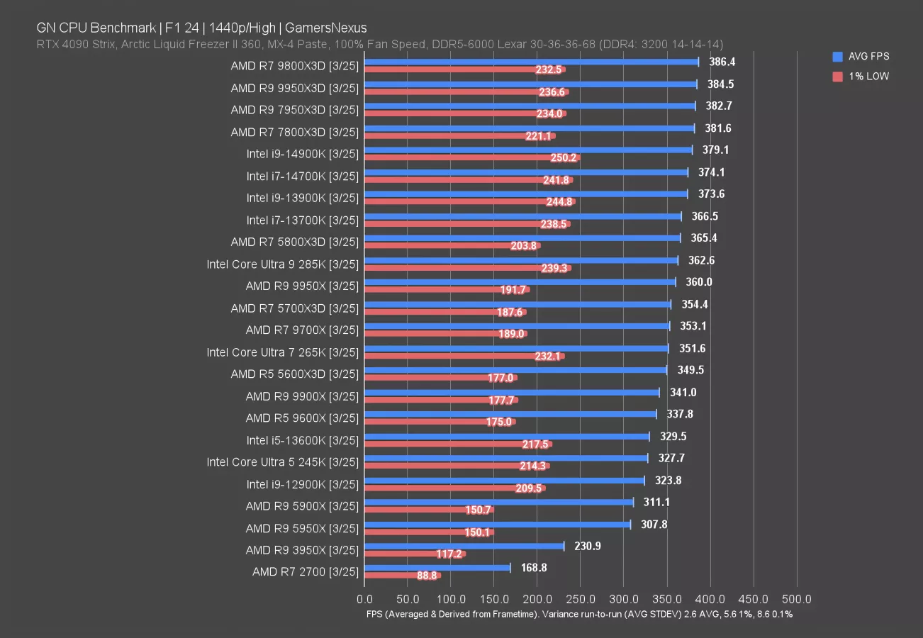 The 5800X3D (watch our review) remains an excellent CPU, up at 119 FPS AVG. The 9950X3D and 9800X3D outrank it by about 30%. As for Intel, it remains uncompetitive here. The 285K is getting crushed by two prior Intel generations for reasons discussed in that review, and that’s with new Windows updates.