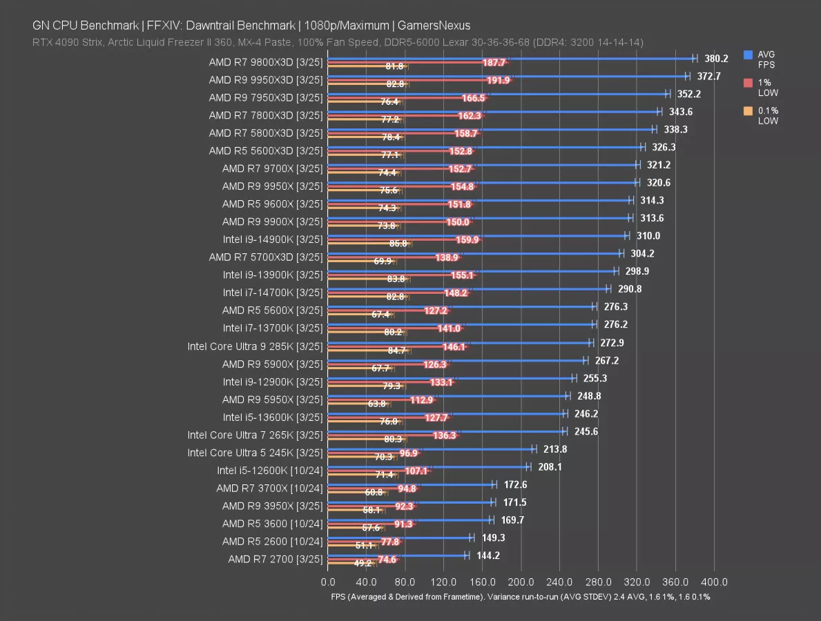 Final Fantasy 14: Dawntrail is up now. In this one, the 9800X3D ran at 380 FPS AVG, with the 9950X3D at 373 FPS AVG. We observed relatively wide run-to-run variance in some of these results, so the error bars are wider than typical. The 9800X3D leads the 9950X3D by just 2%, so they are functionally equal.