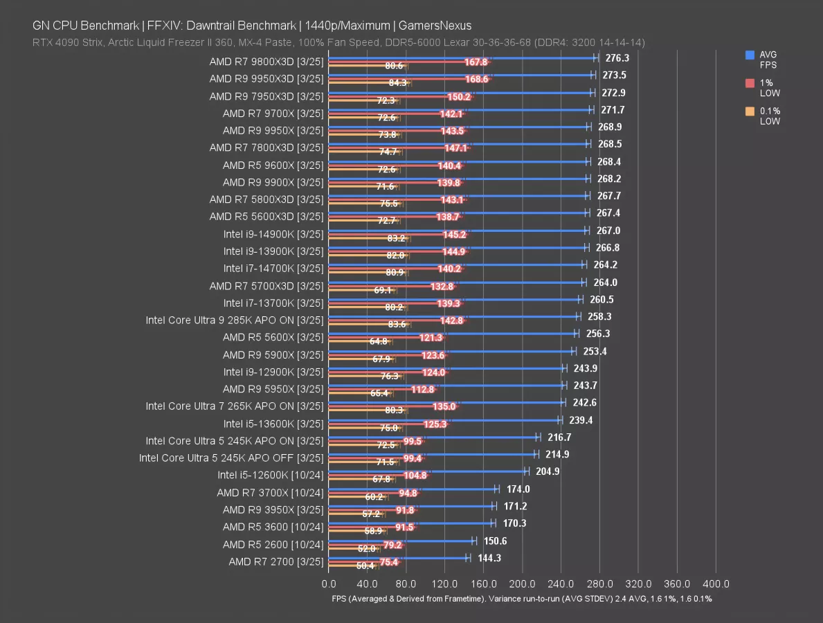 Intel’s closest CPUs don’t appear until the 14900K at 310 FPS AVG. This is mostly interesting because there was a time when Final Fantasy’s prior benchmark versions were entirely dominated by Intel, with the clean division halfway down the chart. This is actually what we’re seeing now favoring AMD, relegating Intel to the bottom. That’s flipped in recent years and generations.