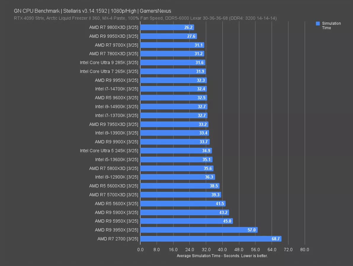 For Stellaris, the 9800X3D and 9950X3D both perform at the top of the chart. The 9800X3D outperformed the 9950X3D with a reduction in simulation time of 5%. That’s near error, but not quite. This seems to be a combination of a higher base clock and utilization.