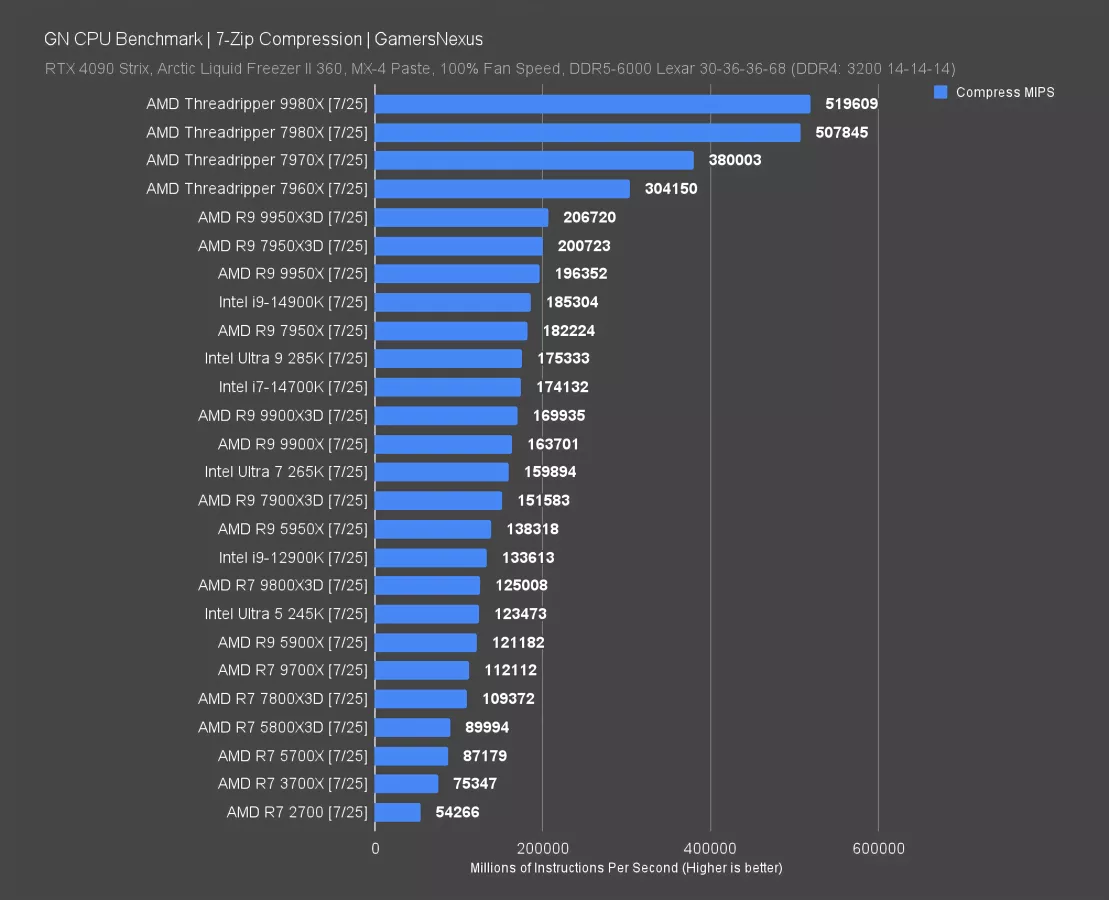 Intel’s newer generation does OK in this test, with the 285K between the 9950X and 7950X. It’s also one of the tests where Intel doesn’t see regressive performance, though we still wouldn’t recommend the 285K. That entire platform is dead, anyway.