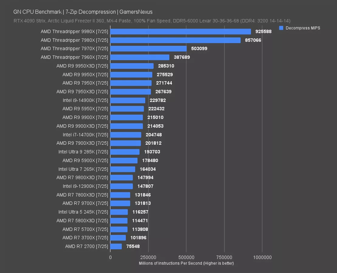 In decompression, the 9980X scaled up to 926K MIPS, gaining 8% on the 7980X’s 857K MIPS. This is a better showing than what we saw in compression and posts better scaling. The rest of the lineup is familiar to the prior examples. Extra cache doesn’t help as much in this test as compared to the compression test, as the 7950X3D is now below the 9950X. This would align with the speed benefit providing more of an uplift on Threadripper as well.
