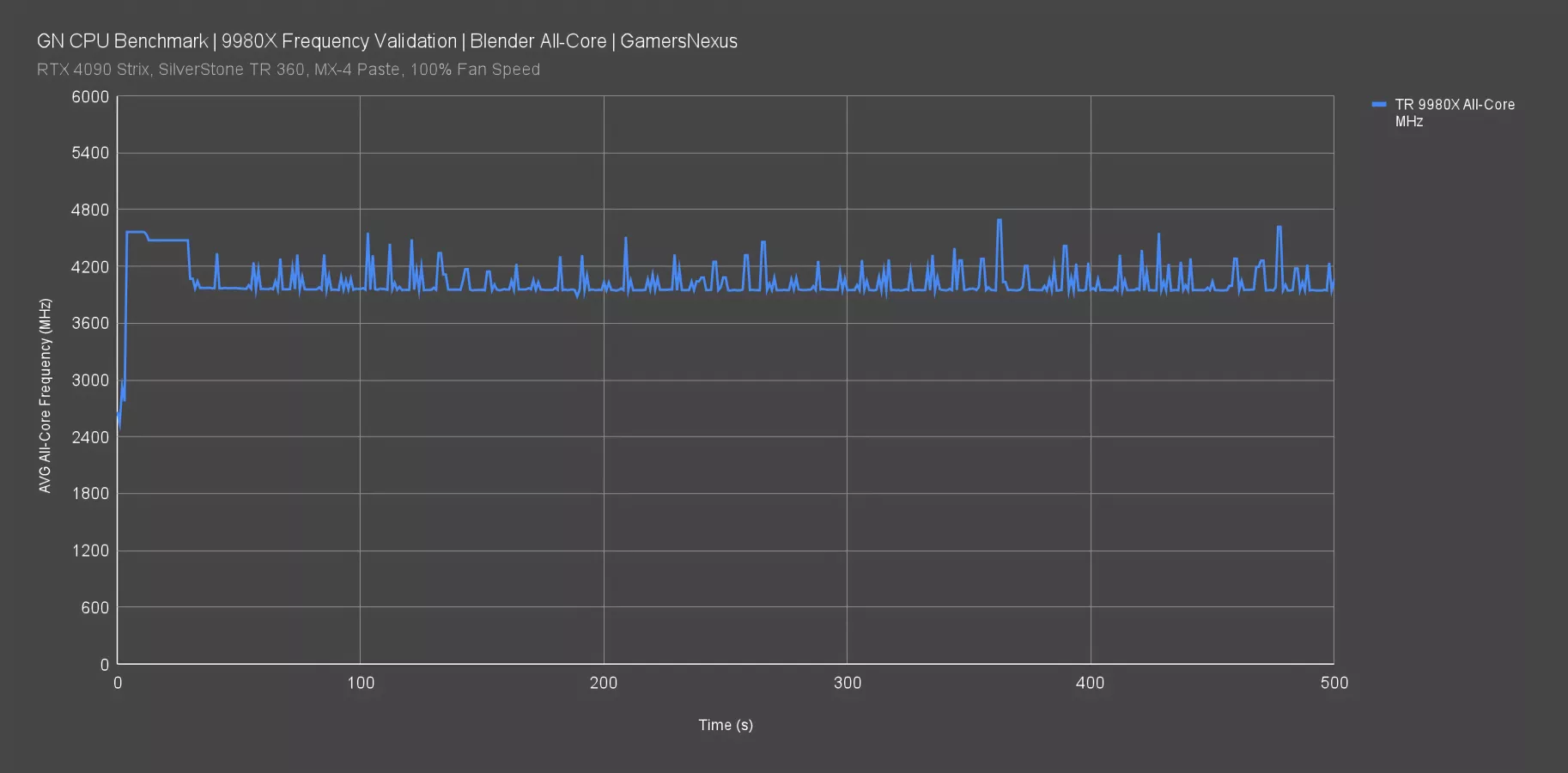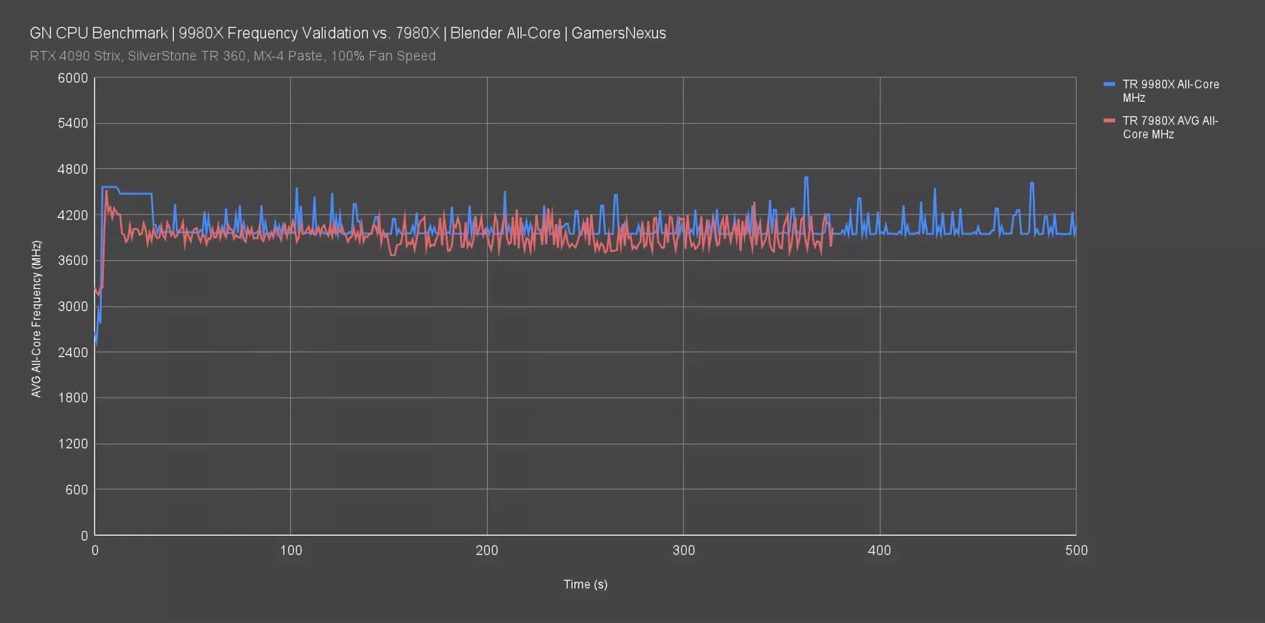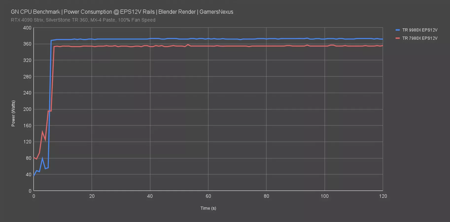 This next chart shows the power consumption as measured at the EPS12V cables with a power interposer between the motherboard and power supply. Tested with an all-core workload in Blender, we observed stable and consistent power draw across both the 7980X and 9980X CPUs, with the 9980X measuring at 371W from 354W on the last-gen Threadripper flagship. That’s a lot of power to cool.
