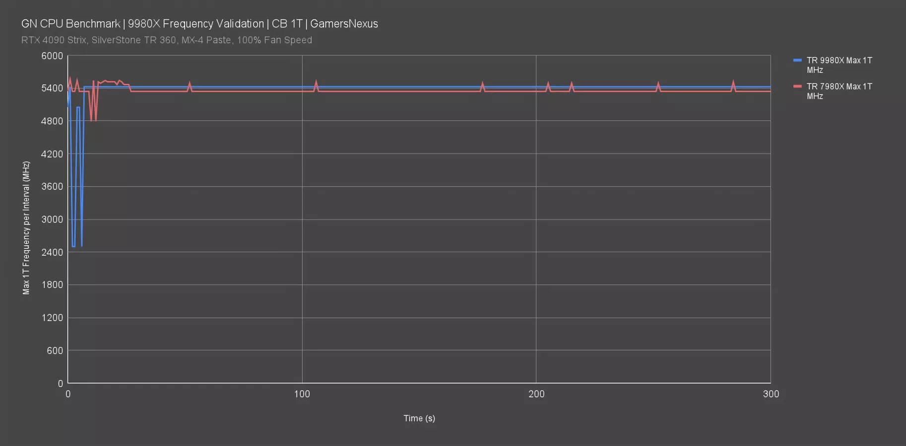 In a single-threaded test with Cinebench, the 9980X ran at 5425 MHz, exceeding the spec listing of 5.4 GHz for boost. This is also expected behavior, with the more limited load boosting higher. The 7980X in the same test ran at about 5340 MHz, so the single-thread frequency has improved generationally -- but not much, and that’s why some benchmarks only show a couple percentage points of change.