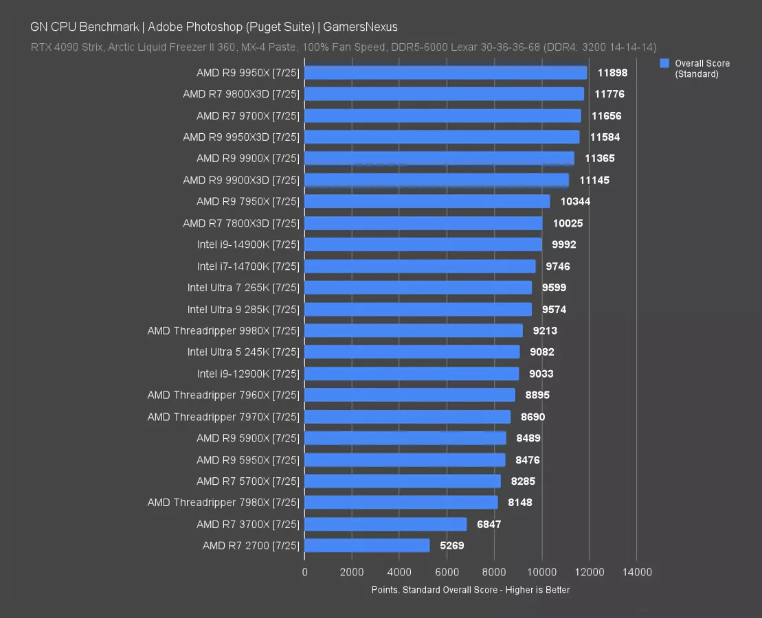 The best performer here is the 9950X, followed by other desktop CPUs. The Threadripper parts fall further down the chart, with the 9980X in particular underperforming. We’ve seen this in the past, such as with the 7980X: They just have too many threads for their own good and Photoshop isn’t able to utilize them. The 7980X is outperformed by the 7970X and 7960X, so the 9980X landing in the middle isn’t a surprise. Its main improvement comes from the frequency.