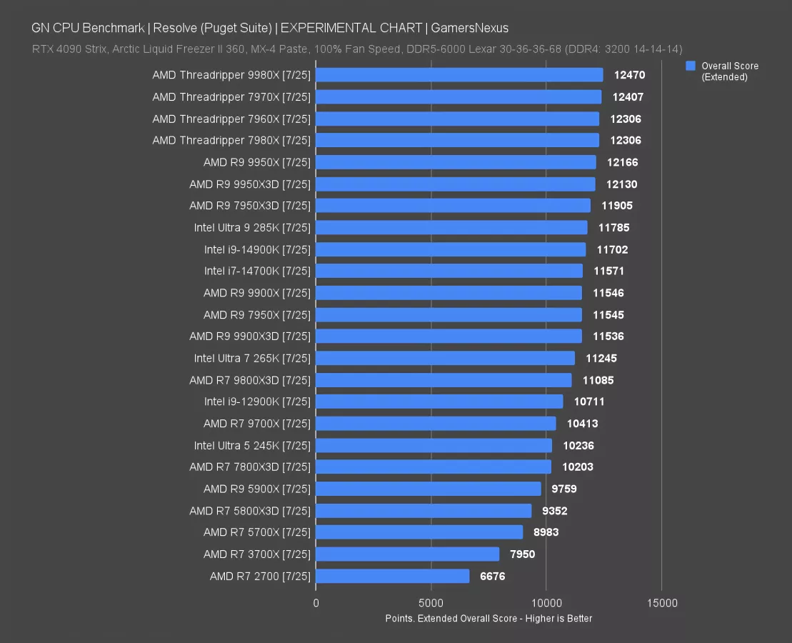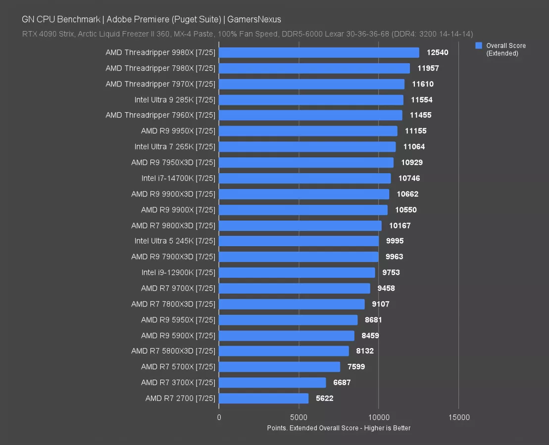 The improvement is almost 5% from the 7980X to the 9980X in the extended score for Premiere. Intel’s 285K trails most Threadripper CPUs in the chart and roughly ties the 7960X. It also technically outperforms the 9950X. Intel’s biggest advantage remains in its QuickSync solution with the IGP, which would show up disproportionately in more targeted tests rather than the full sweep done here.