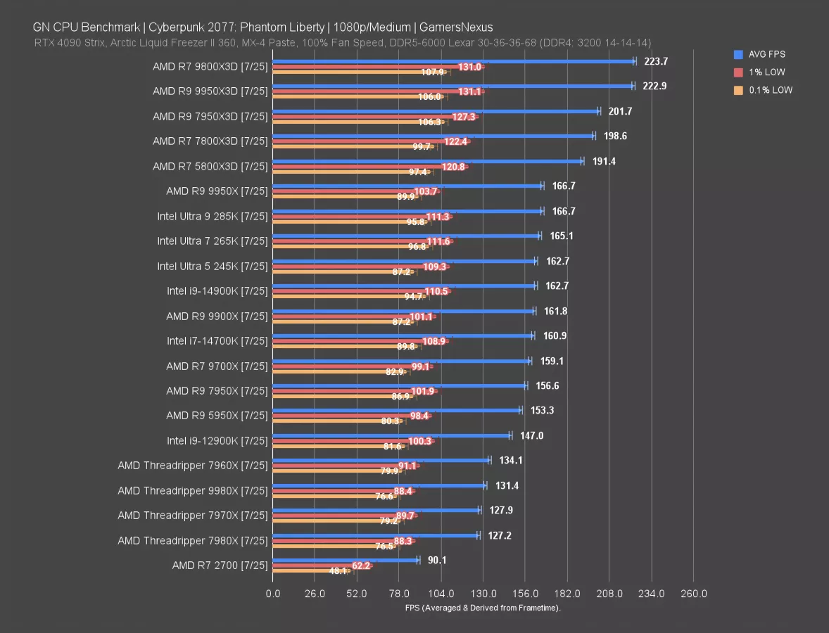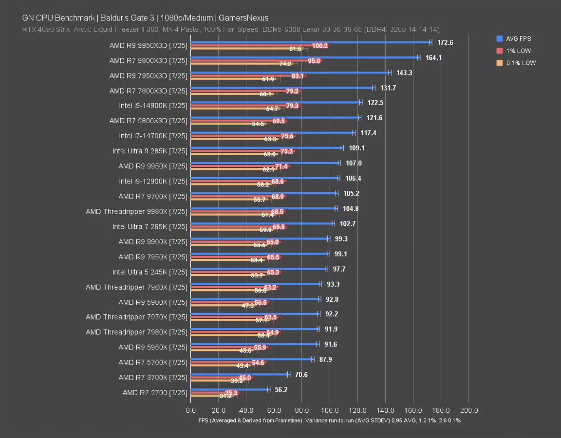 In Baldur’s Gate 3, the 9980X ends up around the level of the 265K -- which is really just more embarrassing for Intel than anything else. We already know Threadripper isn’t particularly good at gaming, despite being OK at it, but the 265K should be doing better here. This is also a game where the 285K was hugely regressive, though, at 109 FPS AVG against the 14700K’s 117 FPS AVG and 14900K’s 123 FPS AVG.