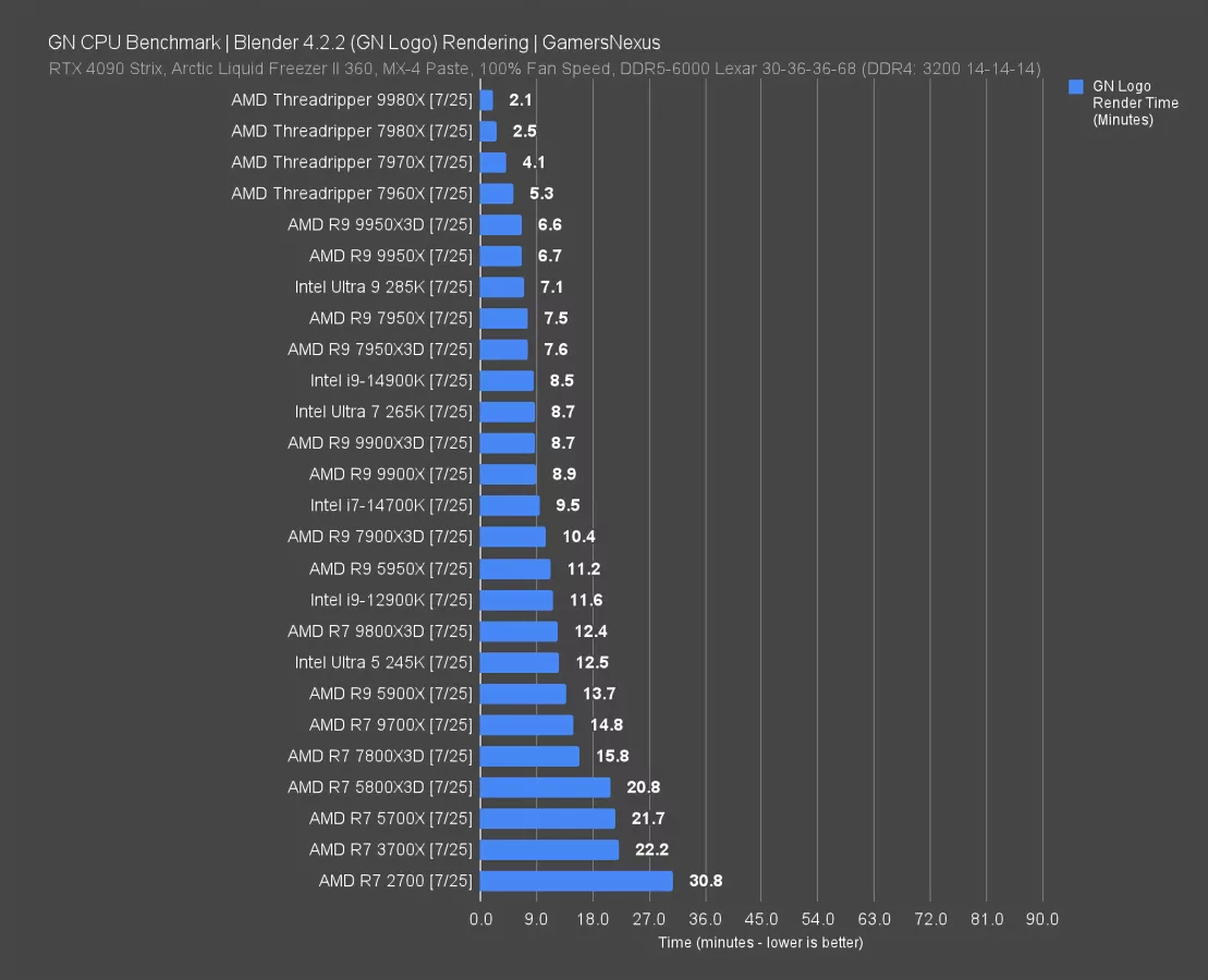 For this process, the 9980X is the new chart-topper at 2.1 minutes to complete a render of a single frame from the GN intro animation logo. The next fastest is the 7980X at 2.5 minutes, which makes sense: This test is heavily thread-dependent, so threads will outrank frequency where large differences emerge.