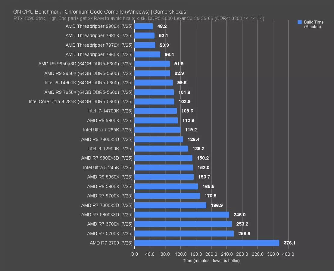 The 9980X completes the compile the fastest, at 48 minutes total. The compile time is 7.5% reduced from the 7980X. Elsewhere, with the newer version of this test, we’re seeing reduced impact compared to prior test iterations. The 7980X and 7970X are relatively close to each other, with the 9950X3D and 9950X also near each other. Some of these CPUs are running with reduced memory speed as they required higher memory capacity and had more trouble holding our usual settings, so those are noted where true.