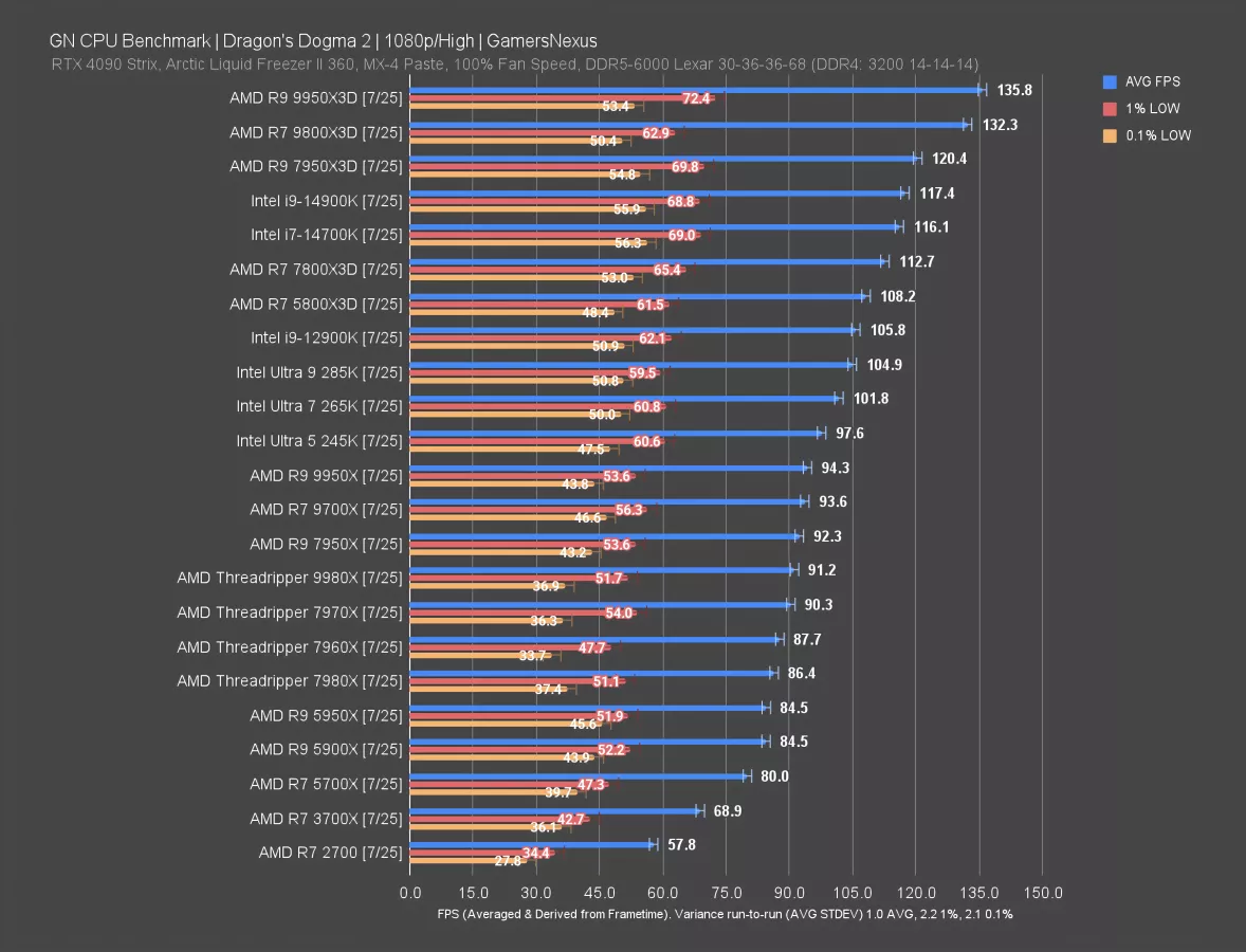 Final Fantasy 14: Dawntrail is next. The 9980X and 7980X high core-count CPUs had some major inconsistency issues in this game, so there’s an asterisk next to their entries.