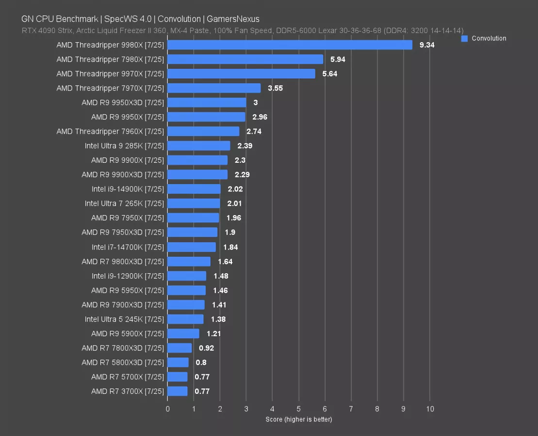 Although we have our 9970X review coming up separately, we’ll note that it also saw a 56% improvement here over the 7970X predecessor. The results align. Looking at last gen, the 9950X improved on the 7950X by 50%, which is consistent generationally. The results appear to be consistent and are present across numerous CPUs cross-generation, which means the only thing left to consider is whether this benchmark represents real-world scenarios. We’re not sure: This particular test exits our expertise, as we don’t do signal processing or image analysis work. We’d love to hear from those in our audience as to whether the Spec Convolution test aligns with real-world applications that you use in your work life.