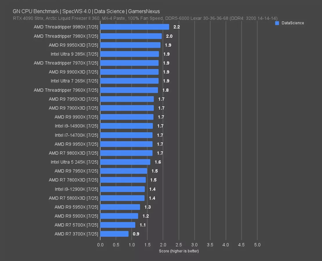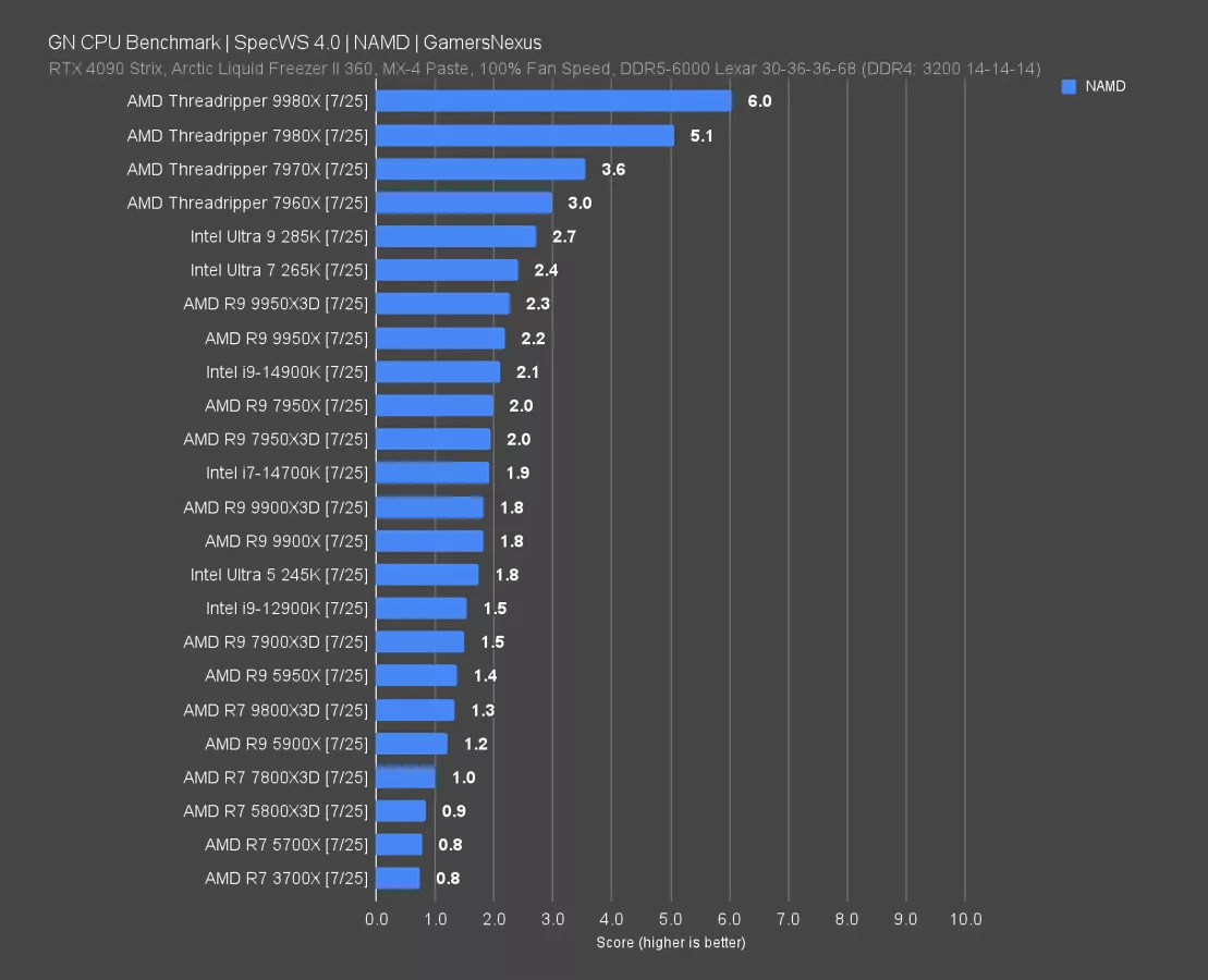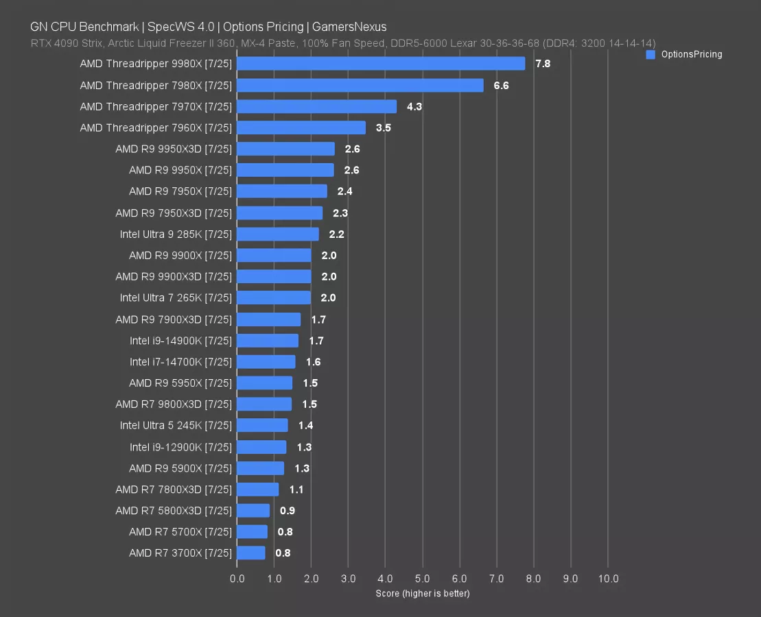 The results have the 9980X at the top, with a 7.8 score. That has it improved on the 7980X by an impressive 18%, aligning with the findings of the 9000 series desktop parts against the 7000 series in this same test. You can see that in the 9800X3D against the 7800X3D or the 9900X3D vs. 7900X3D. This is an architectural benefit. It’s one of the rare break-outs for Zen 5 that we talked about after the initial round of reviews when we had validated it as a legitimate deviation.