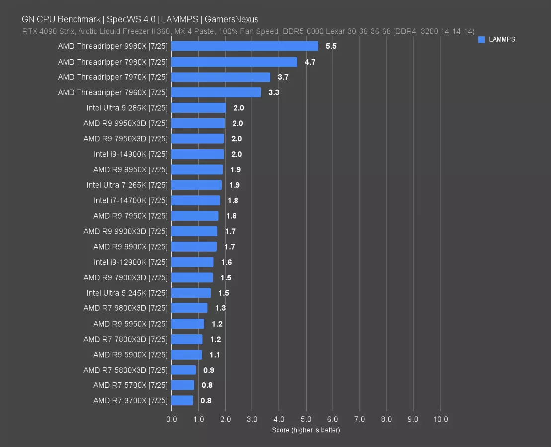 LAMMPS has the 9980X at a 5.5 score in Spec, leading the 7980X by 17%. This is close to the Options Pricing results. Although Spec has several tests where there’s no real impact, like Handbrake, it also has a higher saturation of tests with larger generational improvements.