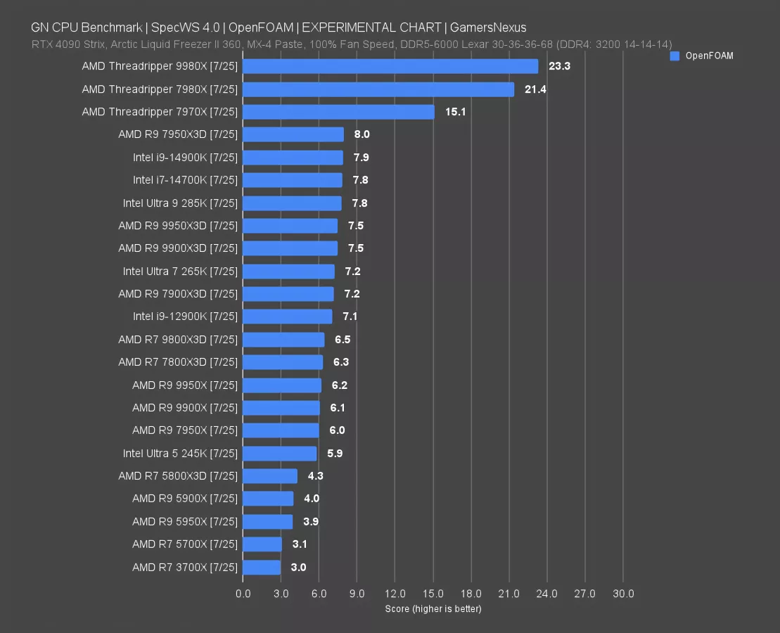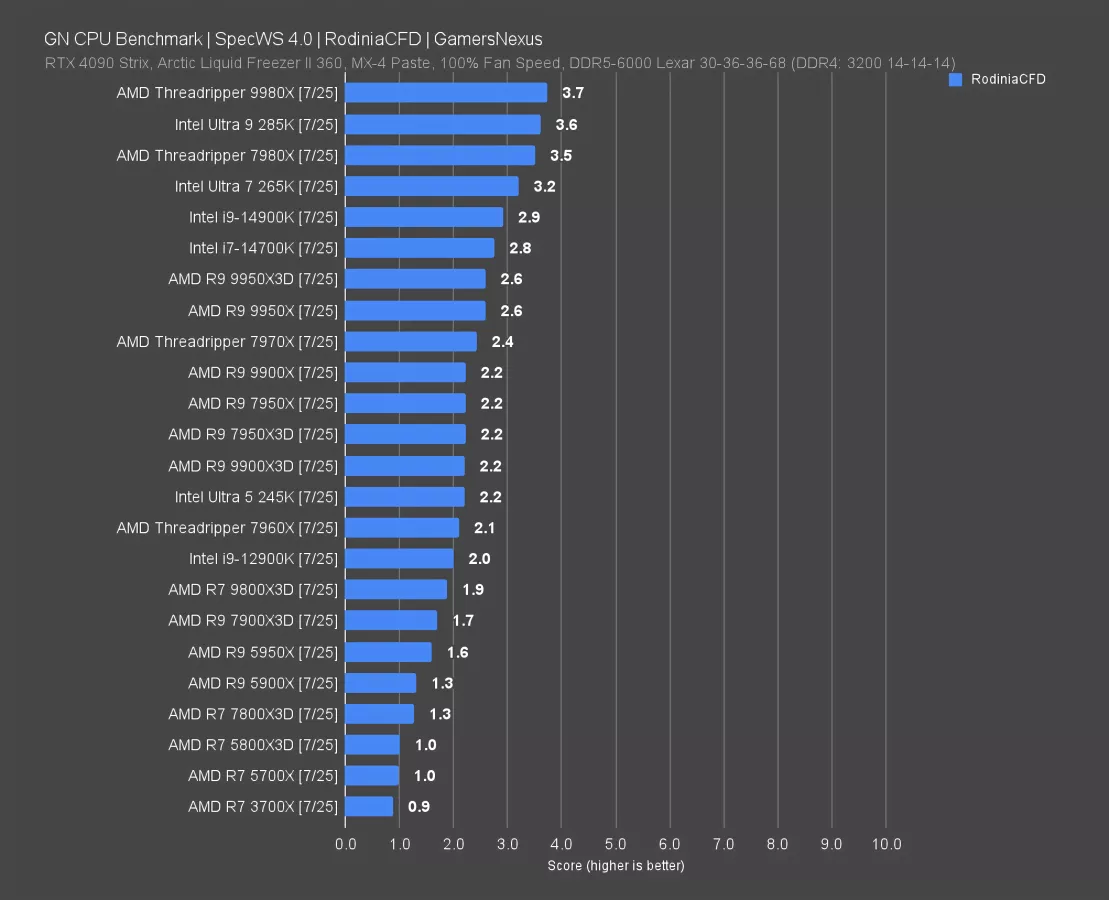 The 9980X improves on the highest-end desktop 9950X3D by 200%, basically being the difference between being runnable and not. Threadripper really makes an impact here, and the generational gain is real but rare in this one test.