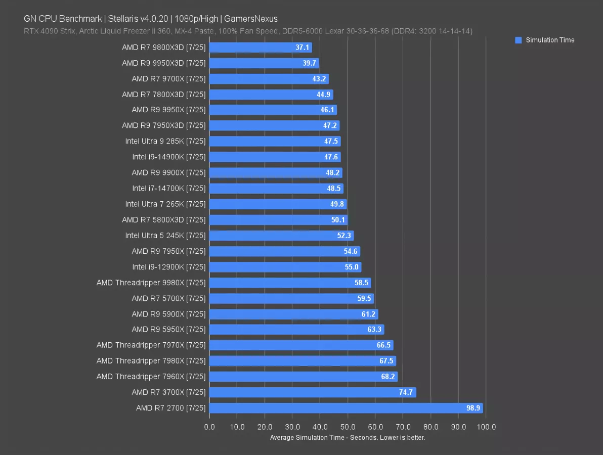 Threadripper is way at the bottom, with the 9980X at least improving on the 7980X notably, but it’s still far worse than any other modern gaming CPU. The 5700X is nearly at the level of the 9980X. It’s just detrimental to have this CPU configuration for this game, which isn’t really news to anyone. It can at least play games, but the difference in simulation time between the 9800X3D and the 9980X would be noticeable in real game play.