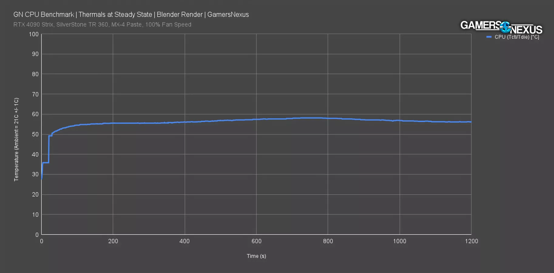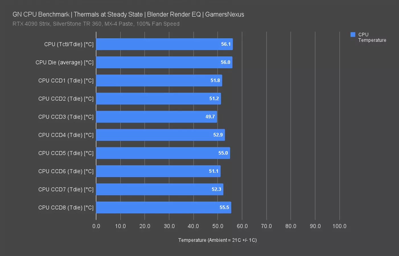 This chart shows thermals at steady state across the various CCDs. The CCD-to-CCD delta here is 6.7 degrees Celsius, at 49.7 to 56.1 degrees in an ambient of 21 degrees Celsius, +/- 1C. Generally speaking, this can be cooled at lower noise levels with 360mm coolers without major issues if assuming a well-ventilated case. The surface area is so huge on this CPU that the power is distributed across a large area, making it easier to cool than a 200W heat load might be on a normal desktop-sized Ryzen CPU with 2 CCDs.